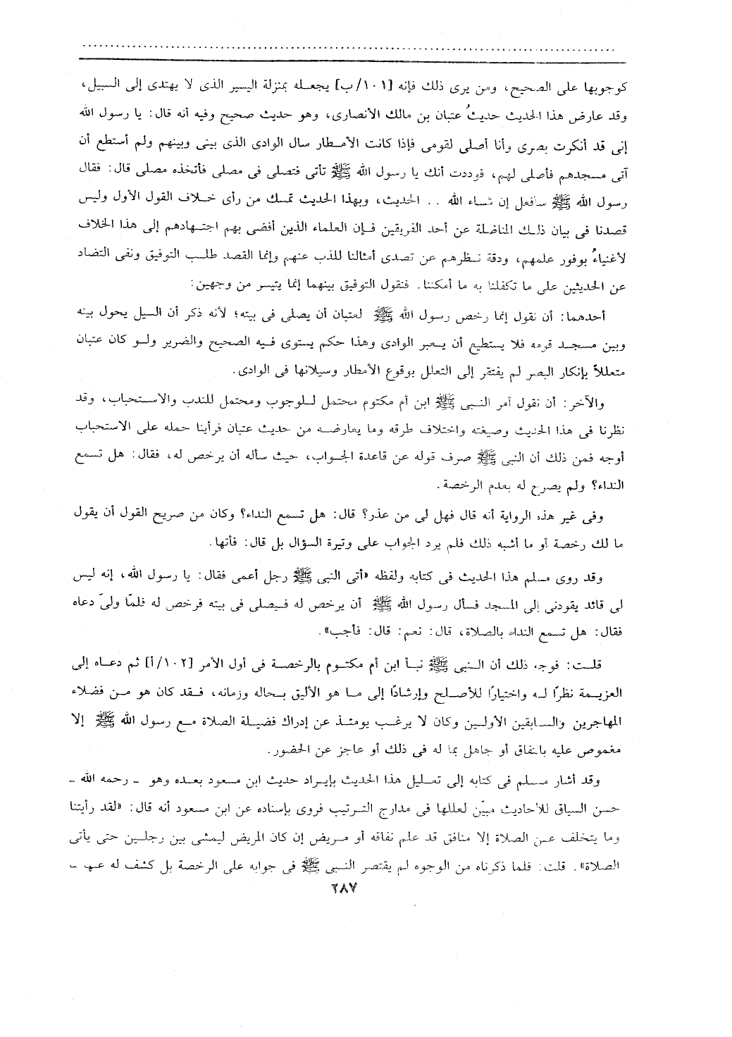 وقد أشار مسلم في كتابه إلى تعليل هذا الحديث بإيراد حديث ابن مسعود بعده هو- رحمه الله- حسن السياق للأحاديث مبين لعللها في مدارج الترتيب فروى بإسناده عن ابن مسعود أنه قال: (لقد رأيتنا وما يتخلف عن الصلاة إلا منافق قد علم نفاقه أو مريض إن كان المريض ليمشي بين رجلين حتى يأتي الصلاة). قلت: فلما ذكرناه من الوجوه لم يقتصر النبي - صلى الله عليه وسلم - في جوابه على الرخصة بل كشف له عنها