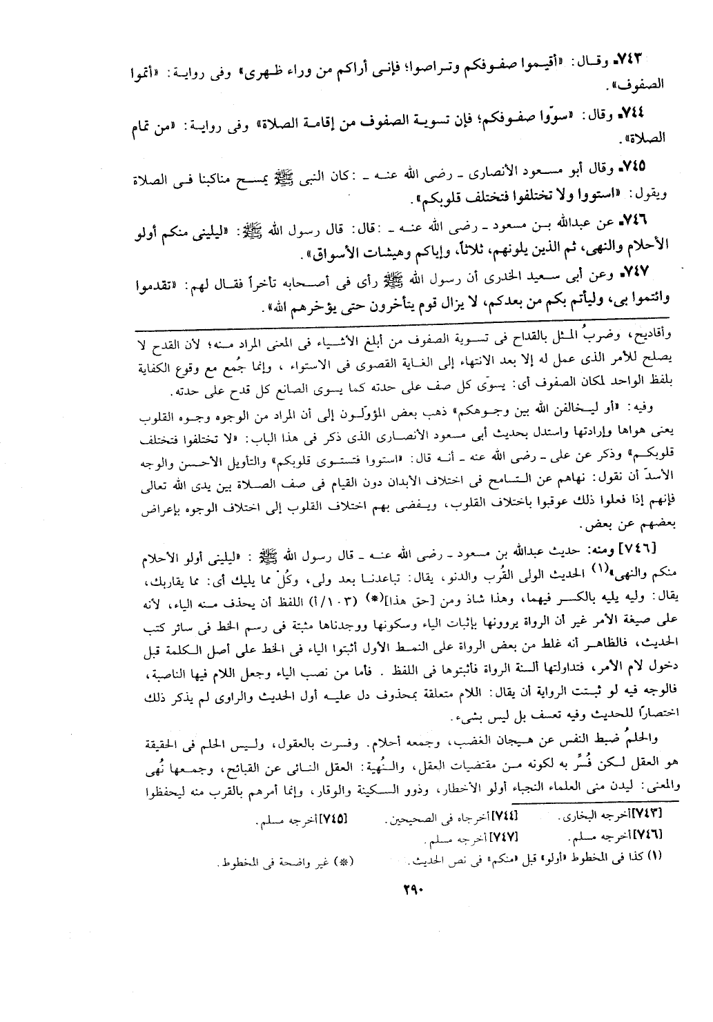 وفيه: (أو ليخالفن الله بين وجوهكم) ذهب بعض المؤولون إلى أن المراد من الوجوه وجوه القلوب يعني هواها وإرادتها واستدل بحديث أبي مسعود الأنصاري الذي ذكر في هذا الباب: (لا تختلفوا فتختلف قلوبكم) وذكر عن علي- رضي الله عنه- أنه قال: (استووا فتستوي قلوبكم) والتأويل الأحسن والوجه الأسد أن نقول، نهاهم عن التسامح في اختلاف الأبدان دون القيام في صف الصلاة بين يدي الله تعالى فإنهم إذا فعلوا ذلك عوقبوا باختلاف القلوب، ويفضي بهم اختلاف القلوب إلى اختلاف الوجوه بإعراض يعضهم عن بعض.