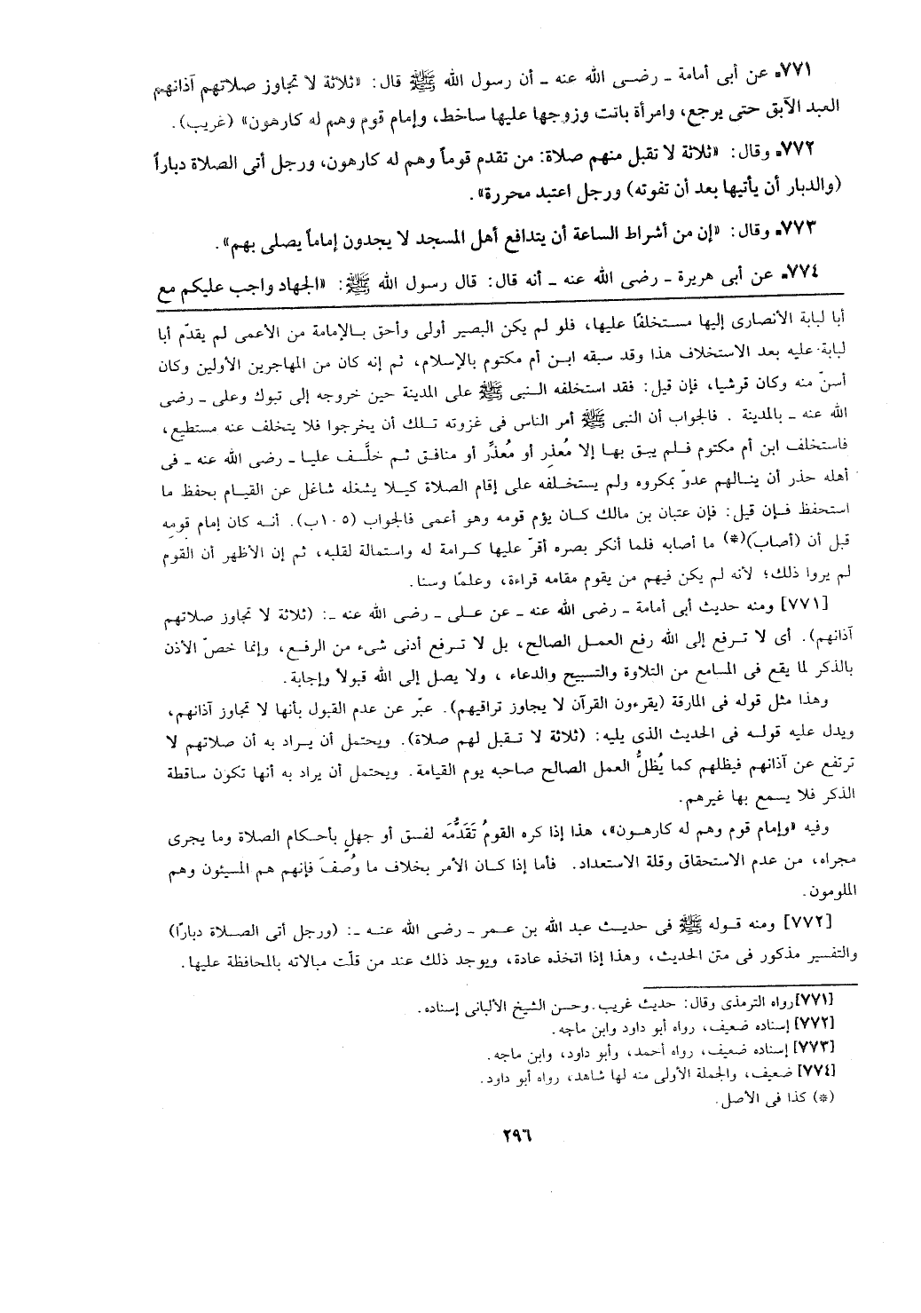 [771] ومنه حديث أبي أمامة- رضي الله عنه- عن علي- رضي الله عنه-: (ثلاثة لا تجاوز صلاتهم آذانهم). أي لا ترفع إلى الله رفع العمل الصالح، بل لا ترفع أدنى شيء من الرفع، وإنما خص الأذن بالذكر لما يقع في المسامع من التلاوة والتسبيح والدعاء، ولا يصل إلى الله قبولا وإجابة.