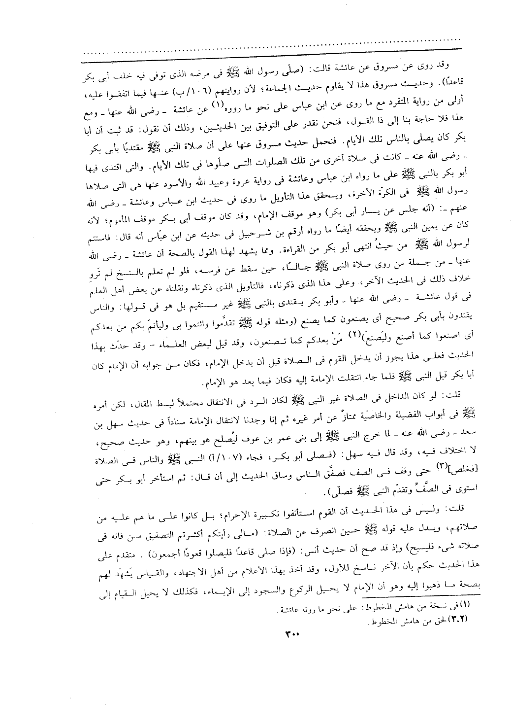 وقد روي عن مسروق عن عائشة قالت: (صلى رسول الله - صلى الله عليه وسلم - في مرضه الذي توفي فيه خلف أبي بكر قاعدا). وحديث مسروق هذا لا يقاوم حديث الجماعة؛ لأن روايتهم (106/ب) عنها فيما اتفقوا عليه، أولى من رواية المتفرد مع ما روي عن ابن عباس على نحو ما رووه عن عائشة- رضي الله عنها- ومع هذا فلا حاجة بنا إلى ذا القول، فنحن نقدر على التوفيق بين الحديثين، وذلك أن نقول: قد ثبت أن أبا بكر كان يصلي بالناس تلك الأيام. فنحمل حديث مسروق عنها على أن صلاة النبي - صلى الله عليه وسلم - مقتديا بأبي بكر- رضي الله عنه- كانت في صلاة أخرى من تلك الصلوات التي صلوها في تلك الأيام. والتي اقتدى فيها أبو بكر النبي - صلى الله عليه وسلم - على ما رواه ابن عباس وعائشة في رواية عروة وعبيد الله والأسود عنها هي التي صلاها رسول الله - صلى الله عليه وسلم - في الكرة الآخرة، ويحقق هذا التأويل ما روي في حديث ابن عباس وعائشة- رضي الله عنهم-: (أنه جلس عن يسار أبي بكر) وهو موقف الإمام، وقد كان موقف أبي بكر موقف الإمام؛ لأنه كان عن يمين النبي - صلى الله عليه وسلم - ويحققه أيضا ما رواه أرقم بن شرحبيل في حديثه عن ابن عباس أنه قال: فاستتم لرسول الله - صلى الله عليه وسلم - من حيث انتهى أبو بكر من القراءة. ومما يشهد لهذا القول بالصحة أن عائشة- رضي الله عنها- من جملة من روى صلاة النبي - صلى الله عليه وسلم - جالسا، حين سقط عن فرسه، فلو لم تعلم بالنسخ لم ترو خلاف ذلك في الحديث الآخر، وعلى هذا الذي ذكرناه، فالتأويل الذي ذكرناه ونقلناه عن بعض أهل العلم في قول عائشة- رضي الله عنها- وأبو بكر يقتدي بالنبي - صلى الله عليه وسلم - غير مستقيم بل هو في قولها: والناس يقتدون بأبي بكر صحيح أي يصنعون كما يصنع (ومثله قوله - صلى الله عليه وسلم - تقدموا وائتموا بي وليأتم بكم من بعدكم أي اصنعوا كما أصنع وليصنع) من بعدكم كما تصنعون، وقد قيل لبعض العلماء- وقد حدث بهذا الحديث فعلى هذا يجوز أن يدخل القوم في الصلاة قبل أن يدخل الإمام، فكان من جوابه أن الإمام كان أبا بكر قبل النبي - صلى الله عليه وسلم - فلما جاء انتقلت الإمامة إليه فكان فيما بعد هو الإمام.