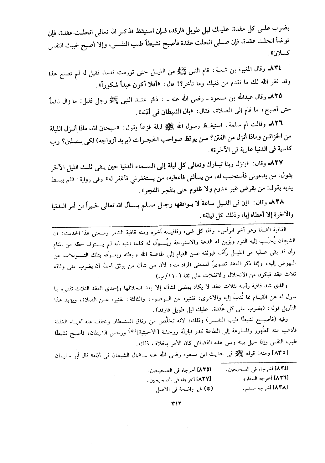 [835] ومنه: قوله ? في حديث ابن مسعود رضي الله عنه: (بال الشيطان في أذنه) قال أبو سليمان