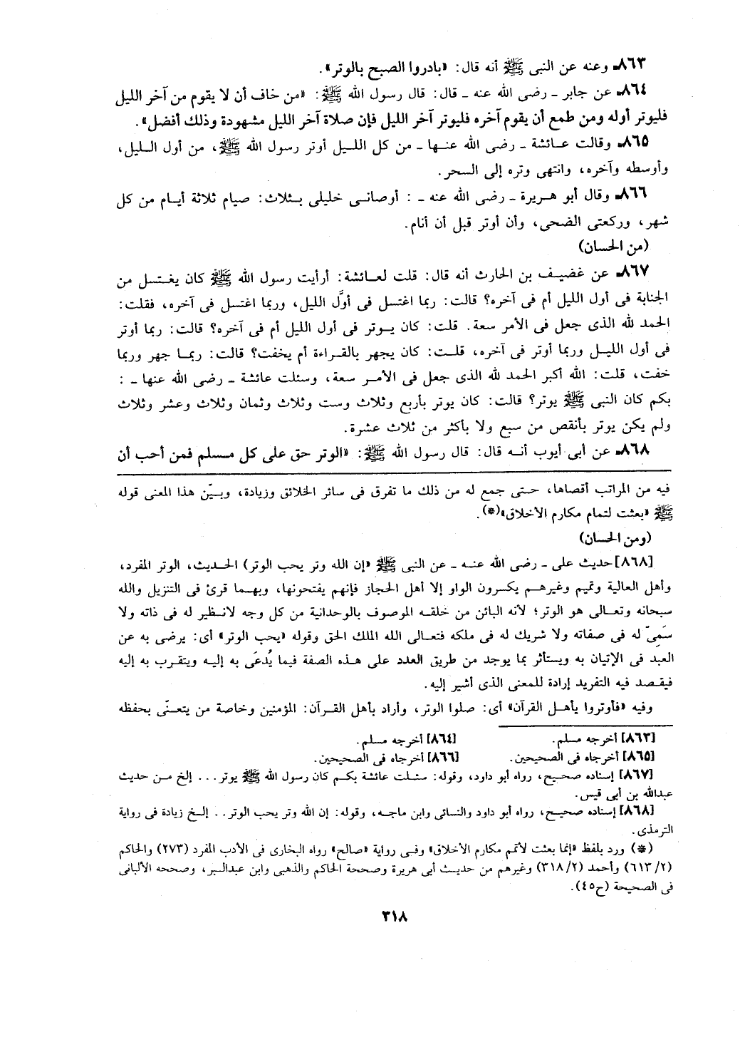 [868] حديث علي - رضي الله عنه - عن النبي ? (إن الله وتر يحب الوتر) الحديث، الوتر المفرد، وأهل العالية وتميم وغيرهم يكسرون الواو إلا أهل الحجاز فإنهم يفتحونها، وبهما قرئ في التنزيل والله سبحانه وتعالى هو الوتر؛ لأنه البائن من خلقه الموصوف بالوحدانية من كل وجه لا نظير له في ذاته ولا سمي له في صفاته ولا شريك له في ملكه فتعالى الله الملك الحق وقوله (يحب الوتر) أي: يرضى به عن العبد في الإتيان به ويستأثر بما يوجد من طريق العدد على هذه الصفة فيما يعى به إليه ويتقرب به إليه فيقصد فيه التفريد إرادة للمعنى الذي أشير إليه.