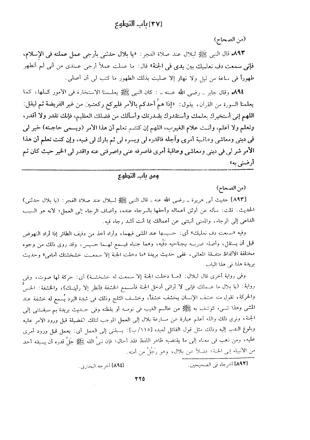 [893] حديث أبي هريرة - رضي الله عنه - قال النبي ? لبلال عند صلاة الفجر: (يا بلال حدثني) الحديث. قلت: سأله عن أوثق أعماله وأحقها بالرجاء عنده، وأضاف الرجاء إلى العمل؛ لأنه هو السبب الداعي إلى الرجاء، والمعنى أنبئني عن أعمالك بما أنت أشد رجاء فيه.