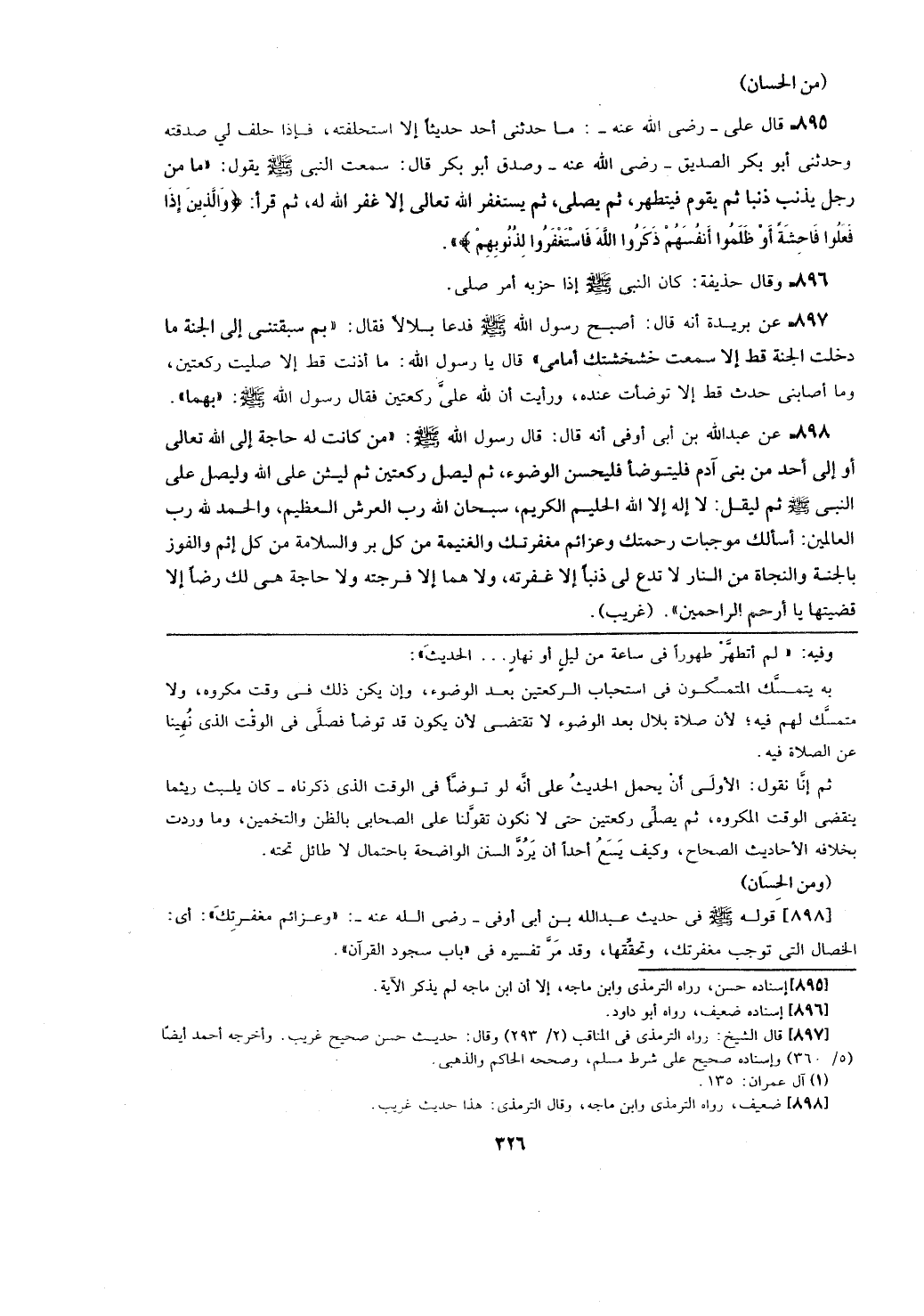 به يتمسك المتمسكون في استحباب الركعتين بعد الوضوء، وإن يكن ذلك في وقت مكروه، ولا متمسك لهم فيه؛ لأن صلاة بلال بعد الوضوء لا تقتضي لأن يكون قد توضأ في الوقت الذي ذكرناه - كا يلبث ريثما ينقضي الوقت المكروه، ثم يصلي اكعتين حتى لا نكون تقولنا على الصحابي بالظن والتخمين، وما وردت بخلافه الأحاديث الصحاح، وكيف يسع أحداً أن يرد السنن الواضحة باحتمال لا طائل تحته.