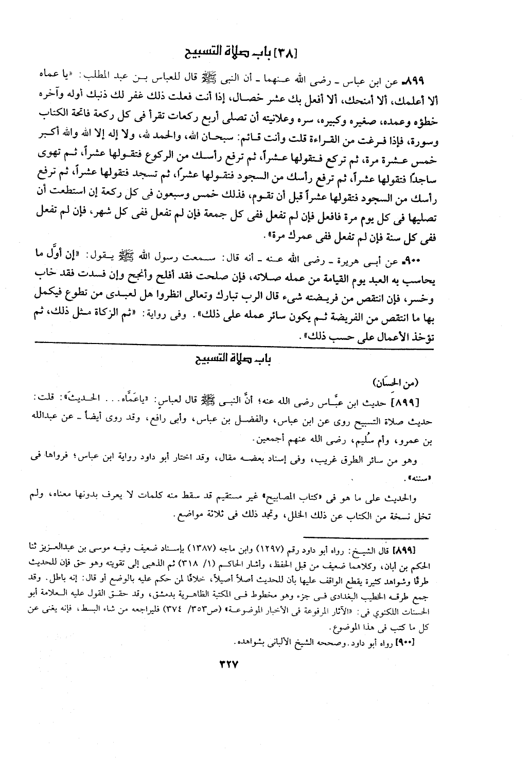 [899] حديث ابن عباس رضي الله عنه؛ أن النبي ? قال لعباس: (يا عماه .... الحديث): قلت: حديث صلاة التسبيح روي عن ابن عباس، والفضل بن عباس، وأبي رافع، وقد روي أيضاً - عن عبد الله بن عمرو، وأم سليم، رضي الله عنهم أجمعين.