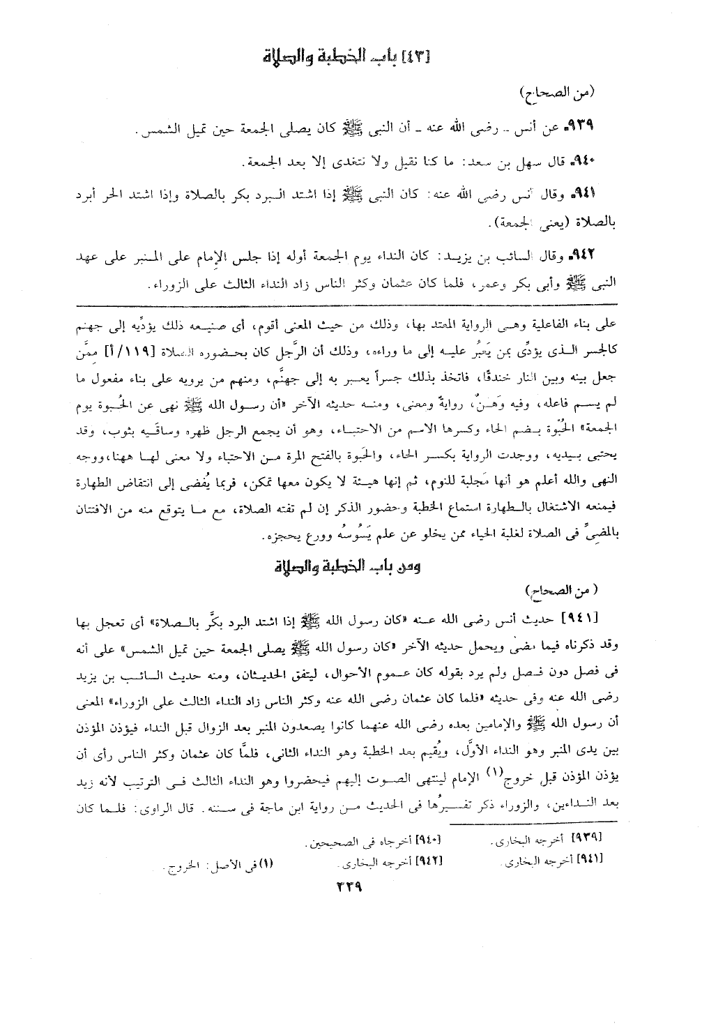 [941] حديث أنس رضي الله عنه (كان رسول الله ? إذا اشتد البرد بكر بالصلاة) اي تعجل بها وفيما ذكرناه فيما مضى ويحمل حديثه الآخر (كان رسول الله ي? صلي الجمعة حين تميل الشمس) على أنه في فصل دون فصل ولم يرد بقوله كان عموم الأحوال، ليتفق الحديثان، ومنه حديث التائب بن يزيد رضي الله عنه وفي حديثه (فلما كان عثمان رضي الله عنه وكثر الناس زاد النداء الثالث على الزوراء) المعنى أن رسول الله ? والإمامين بعده رضي الله عنهما كانوا يصعدون المنبر بعد الزوال قلب النداء فيؤذن المؤذن بين يدي المنبر وهو النداء الأول، ويقيم بعد الخطبة وهو النداء الثاني، فلما كان عثمان وكثر الناس رأى أن يؤذن قبل خروج الإمام اينتهي الصوت إليهم فيحضروا وهو النداء الثالث في الترتيب لأنه زيد بعد النداءين، والزراء ذكر تفسيرها في الحديث من رواية ابن ماجة في سننه. قال الراوي: فلما كان