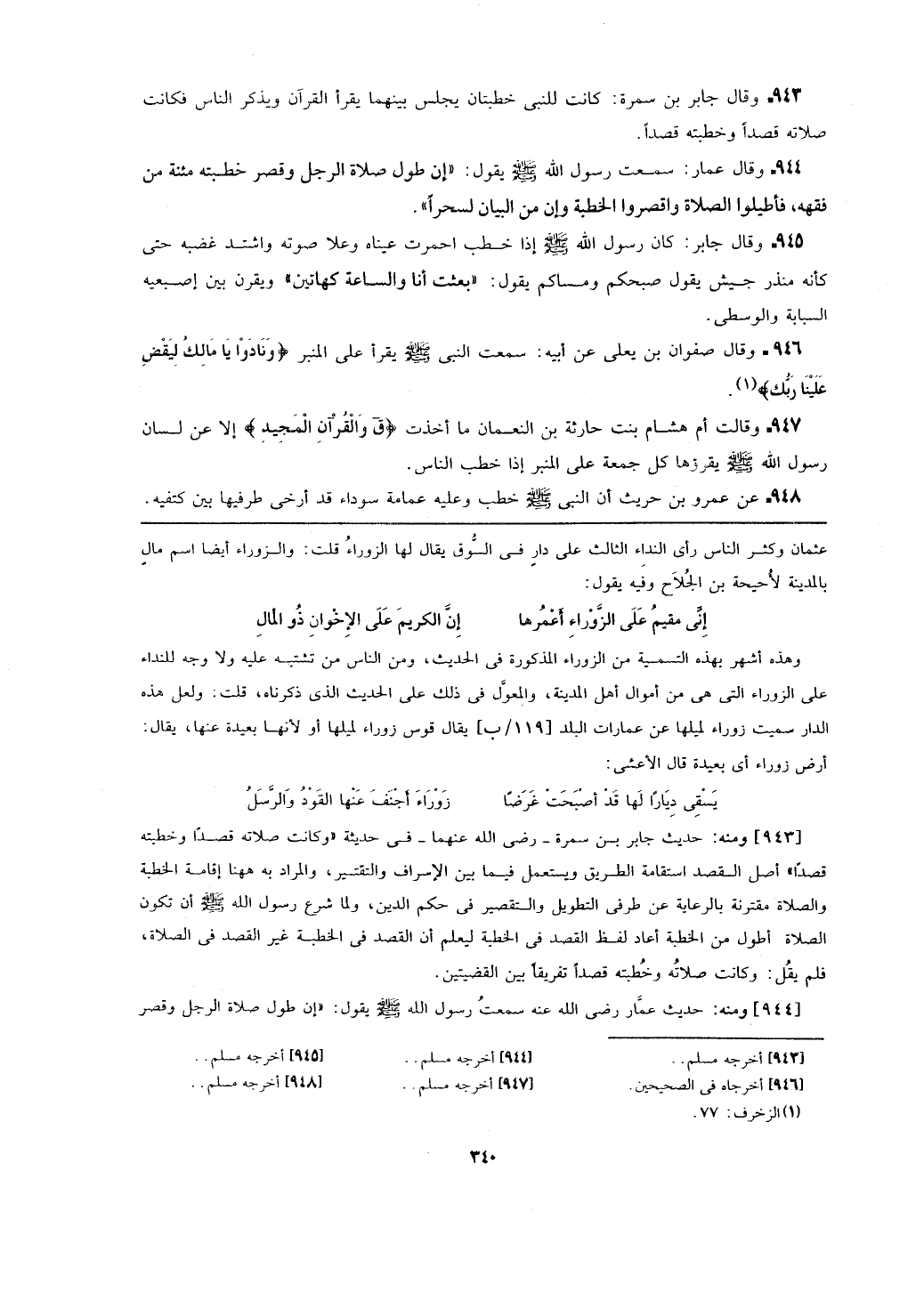 [943] ومنه: حديث جابر بن سمرة - رضي الله عنهما - في حديثه (وكانت صلاته قصداً وخطبته قصداً) أصل القصد استقامة الطريق ويستعمل فيما بين الإسراف والتقتير، والمراد به ههنا إقامة الخطبة والصلاة مقترنة بالرعاية عن طرفي التطويل والتقصير في حكم الدين، ولما شرع رسول الله ? أن تكون الصلاة أطول من الخطبة أعاد لفظ القصد في الخطبة ليعلم أن القصد في الخطبة غير القصد في الصلاة، فلم يقل: وكانت صلاته وخطبته قصداً تفريقاً بين القضيتين.