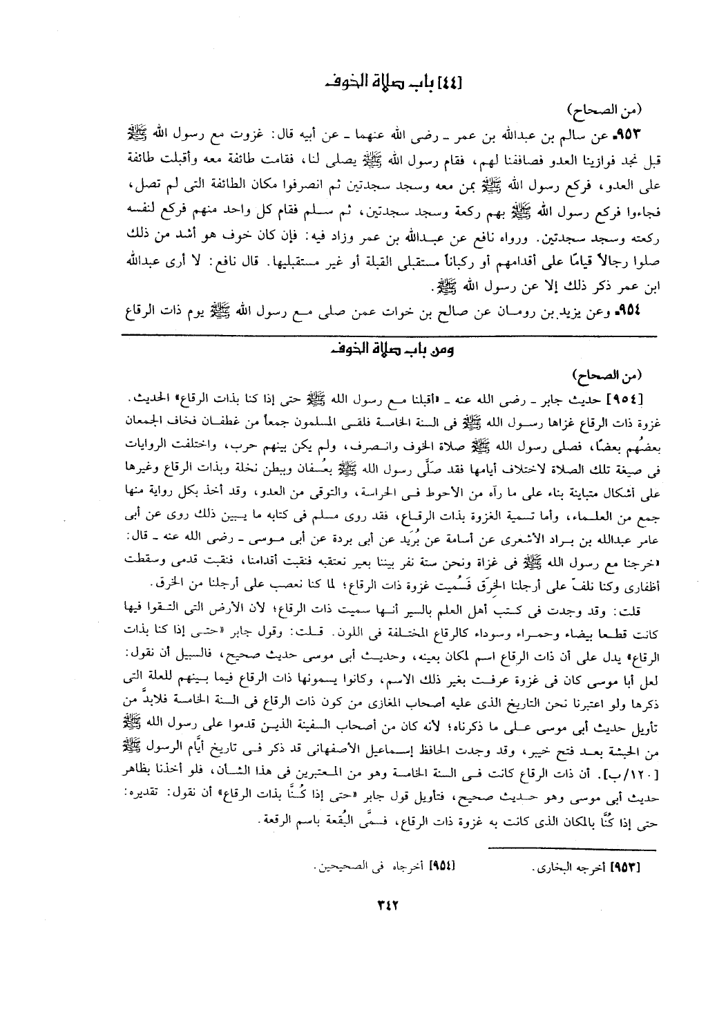 [954] حديث جابر - رضي الله عنه - (أقبلنا مع رسول الله ? حتى إذا كنا بذات الرقاع) الحديث. غزوة ذات الرقاع غزاها رسول الله ? في السنة الخامسة فلقي المسلمون جمعاً من غطفان فخاف الجمعان بعضهم بعضاً، فصلى رسول الله ? صلاة الخوف وانصرف، ولم يكن بينهم حرب، واختلفت الروايات في صيغة تلك الصلاة لاختلاف أيامها فقد صلى رسول الله ? بعفان وببطن نخلة وبذات الرقاع وغيرها على أشكال متباينة بناء على ما رآه من الأحوط في الحراسة، والتوقي من العدو، وقد أخذ بكل رواية منها جمع من العلماء، وأما تسمية الغزوة بذات الرقاع، فقد روي مسلم في كتابه ما يبين ذلك روي عن أبي عامر عبد الله بن يراد الأشعري عن أسامة عن بريد عن ابي بردة عن أبي موسى - رضي الله عنه - قال: (خرجنا مع رسول الله ? في غزاة ونحن ستة نفر بيننا بعير نعتقبه فنقبت أقدامنا، فنقبت قدمي وسقطت أظفاري وكنا نلف على أرجلنا الخرق فسميت غزوة ذات الرقاع؛ لأن الأرض التي التقوا فيها كانت قطعاً بيضاء وحمراء وسوداء كالرقاع المختلفة في اللون. قلت: وقول جابر (حتى إذا كنا بذات الرقاع) يدل على أن ذات الرقاع اسم لمكان بعينه، وحديث أبي موسى حديث صحيح، فالسبيل أن نقول: لعل أبا موسى كان في غزوة عرفت بغير ذلك الاسم، وكانوا يسمونها ذات الرقاع فيما بينهم للعلة التي ذكرها ولو اعتبرنا نحن التاريخ الذي عليه أصحاب المغازي من كون ذات الرقاع فيما بينهم للعلة التي ذكرها ولو اعتبرنا نحن التاريخ الذي عليه اصحاب المغازي من كون ذات الرقاع في السنة الخامسة فلابد من تأويل حديث أبي موسى على ما ذكرناه؛ لأنه كان من أصحاب السفينة الذين قدموا على رسول الله ? من الحبشة بعد فتح خيبر، وقد وجدت الحافظ إسماعيل الأصفهاني قد ذكر في تاريخ أيام الرسول ? [120/ب]. أن ذات الرقاع كانت في السنة الخامسة وهو من المعتبرين في هذا الشأن، فلو أخذنا بظاهر حديث أبي موسى وهو حديث صحيح، فتأويل قول جابر (حتى إذا كنا بذات الرقاع) أن نقول: تقديره: حتى إذا كنا بالمكان الذي كانت به غزوة ذات الرقاع، فسمي البقعة باسم الرقعة.