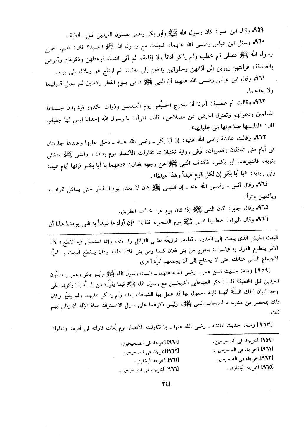[959] ومنه: حديث ابن عمر - رضي الله عنهما - (كان رسول الله ? وأبو بكر وعمر يصلون العيدين قبل الخطبة) قلت: ذكر الصحابي الشيخين مع رسول الله ? فيما يقرره من السنة إنما يكون على وجه البيان لتلك السنة أنها ثابتة معمول بها قد عمل بها الشيخان بعده ولم ينكر عليهما ولم يغير وكان ذلك بمحضر من مشيخة أصحاب النبي ? وليس ذكرهما على سبيل الاشتراك معاذ الإله أن يظن بهم ذلك.