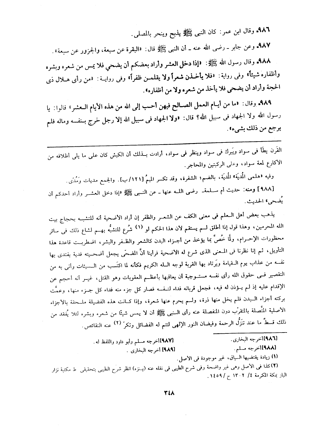 [988] ومنه: حديث أم سلمة - رضي الله عنه - عن النبي ? (إذا دخل العشر وأراد أحدكم أن يضحي) الحديث.