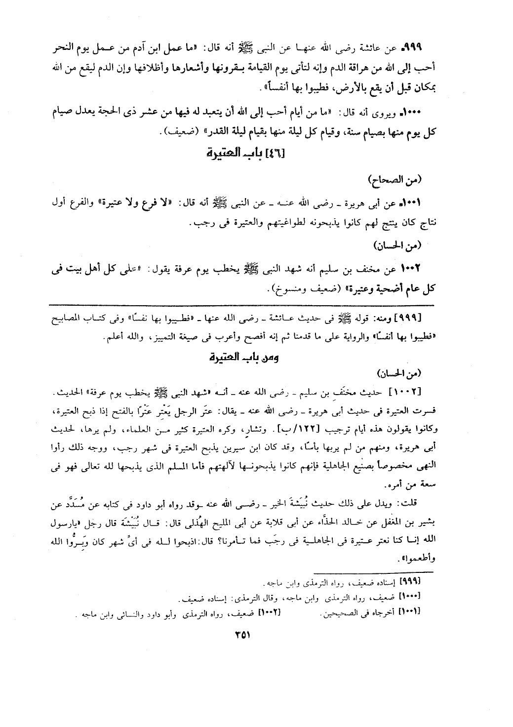 قلت: ويدل على ذلك حديث نبيشة الخير - رضي الله عنه - وقد رواه أوب داود في كتابه عن مسدد عن بشير بن المغفل عن خالد عن أبي قلابة عن أبي المليح الهذلي قال: قال نبيشة قال رجل (يا رسول الله إنا كنا نعتر عتيرة في الجاهلية في رجب فما تأمرنا؟ قال: اذبحوا لله في أي شهر كان وبروا الله وأطعموا).