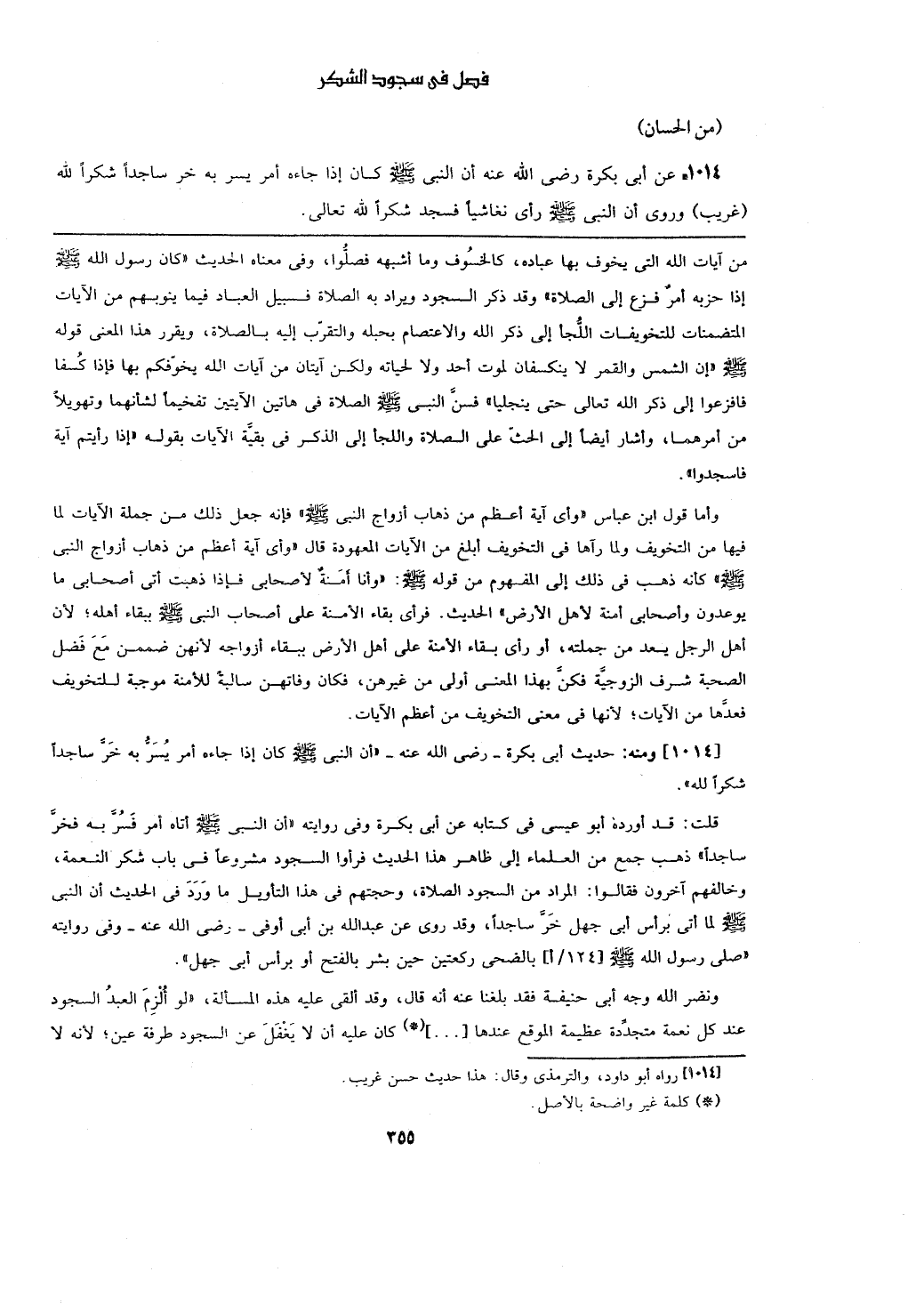 قلت: قد أورده ابو عيسى في كتابه عن أبي بكرة وفي روايته (أن النبي ? أتاه أمر فسر به فخر ساجداً) ذهب جمع من العلماء إلى ظاهر هذا الحديث فرأوا السجود مشروعاً في باب شكر النعمة، وخالفهم آخرون فقالوا: المراد من السجود الصلاة، وحجتهم في هذا التأويل ما ورد في الحديث أن النبي ? لما أتى برأس أبي جهل خر ساجداً، وقد روي عن عبد الله بن أبي أوفى - رضي الله عنه - وفي روايته (صلى رسول الله ? [124/أ] بالضحى ركعتين حين بشر بالفتح أو برأس أبي جهل).