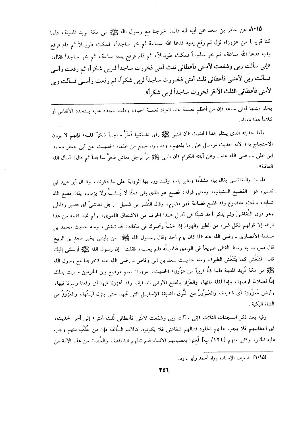 وفيه بعد ذكر السجدات الثلاث (إني سألت ربي وشفعت لأمتي فأعطاني ثلث أمتي) إلى آخر الحديث، أي أعطانيهم فلا يجب عليهم الخلود فتنالهم شفاعتي فلا يكونون كالأمم السالفة فإن من عذب منهم وجب عليه الخلود وكثير منهم [124/ب] لعنوا بعصيانهم الأنبياء فلم تنلم الشفاعة، والعصاة من هذه الأمة من