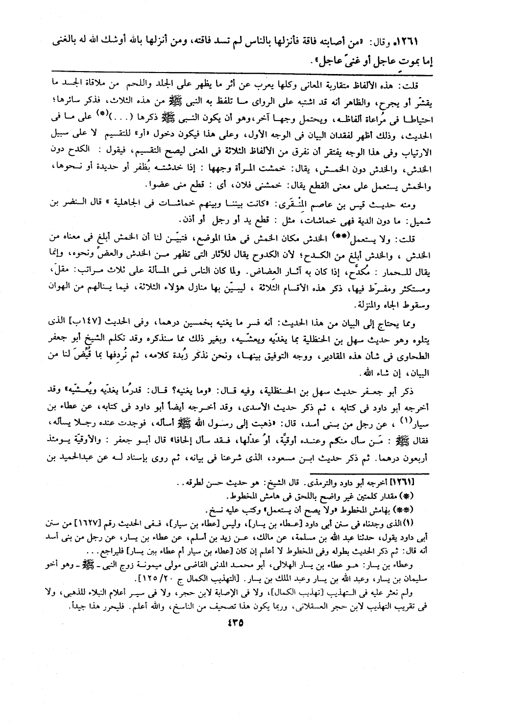 ومما يحتاج إلى البيان من هذا الحديث: أنه فسر ما يغنيه بخمسين درهما، وفي الحديث [147 ب] الذي يتلوه وهو حديث سهل بن الحنظلية مما يغديه ويعشيه، وبغير ذلك مما سنذكره وقد تكلم الشيخ أبو جعفر الطحاوي في شأن هذه المقادير، ووجه التوفيق بينها، ونحن نذكر زبدة كلامه، ثم نردفها بما قيض لنا من البيان، إن شاء الله.