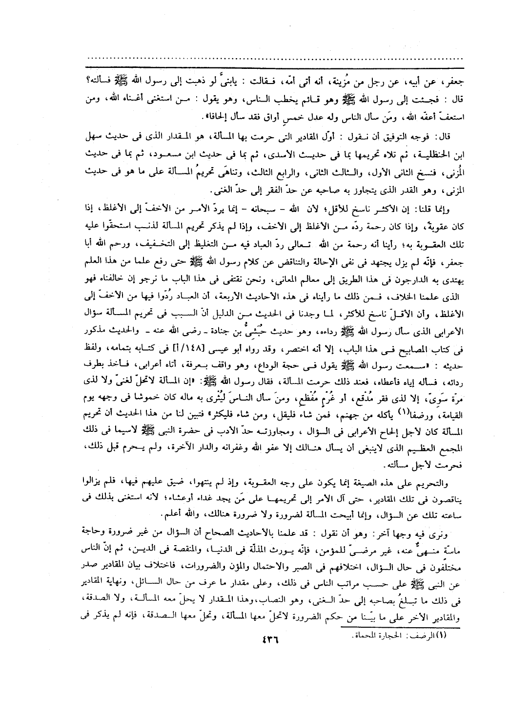 ونرى فيه وجها آخر: وهو أن نقول: قد علمنا بالأحاديث الصحاح أن السؤال من غير ضرورة وحاجة ماسة منهي عنه، غير مرضى للمؤمن، فإنه يورث المذلة في الدنيا، والمنقصة في الدين، ثم إن الناس مختلفون في حال السؤال، اختلافهم في الصبر والاحتمال والمؤن والضرورات، فاختلاف بيان المقادير صدر عن النبي - صلى الله عليه وسلم - على حسب مراتب الناس في ذلك، وعلى مقدار ما عرف من حال السائل، ونهاية المقادير في ذلك ما تبلغ بصاحبه إلى حد الغني، وهو النصاب، وهذا المقدار لا يحل معه المسألة، ولا الصدقة، والمقادير الآخر على ما بينا من حكم الضرورة لا تحل معها المسألة، وتحل معها الصدقة، فإنه لم يذكر في