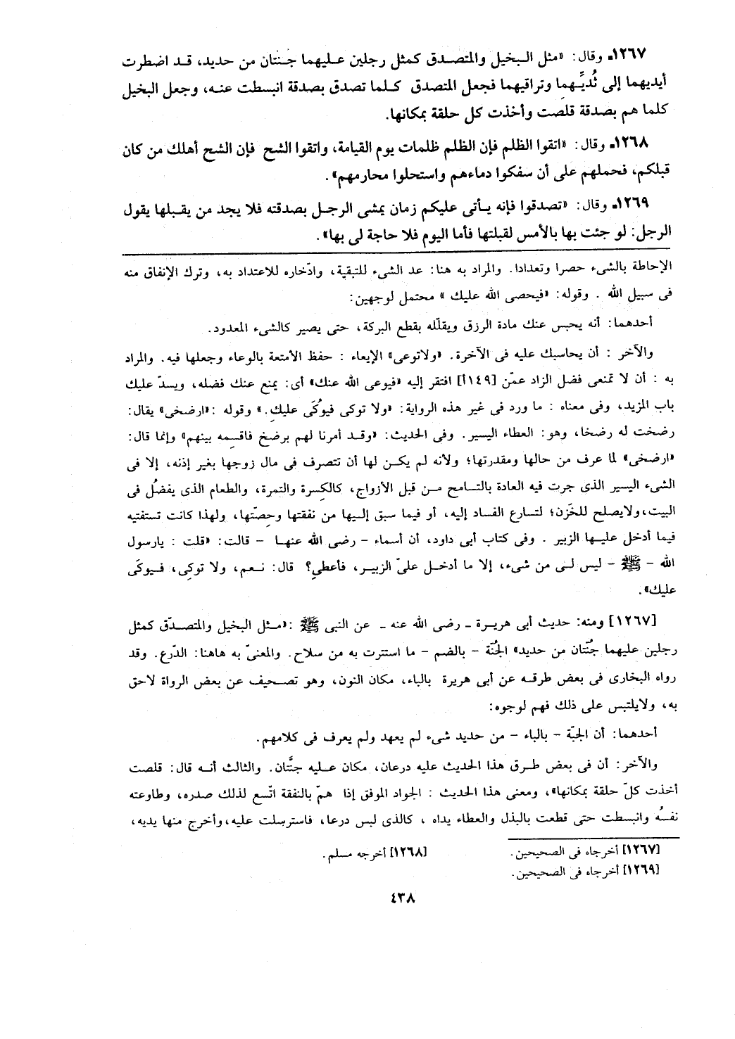 والآخر: أن في بعض طرق هذا الحديث عليه درعان، مكان عليه جنتان. والثالث أنه قال: قلصت أخذت كل حلقة بمكانها)، ومعنى هذا الحديث: الجواد الموفق إذا هم بالنفقة اتسع لذلك صدره، وطاوعته نفسه وانبسطت حتى قطعت بالبذل والعطاء يداه، كالذي لبس درعا، فاسترسلت عليه، وأخرج منها يديه،