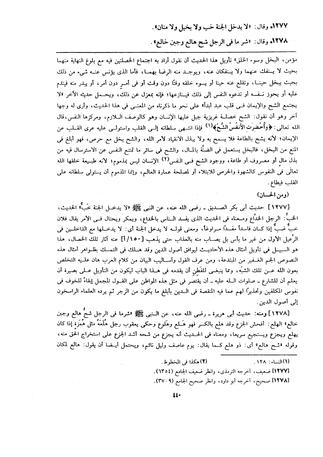 مؤمن، البخل وسوء الخلق) تأويل هذا الحديث أن يقول أراد به اجتماع الخصلتين فيه مع بلوغ النهاية منهما بحيث لا ينفك عنهما ولا ينفكان عنه، ويوجد منه الرضا بهما، فأما الذي يؤنس عنه شيء من ذلك بحيث يبخل حينا، وتقلع عنه حينا أو يسوء خلقه وقتا دون وقت أو في أمر دون أمر، أو يبدر منه فيندم عليه أو يحوز نفسه أو تدعوه النفس إلى فينازعها؛ فإنه بمعزل عن ذلك، ويحمل حديثه الآخر (لا يجتمع الشح والإيمان في قلب عبد أبدا) على نحو ما ذكرناه من المعنى في هذا الحديث، وأرى له وجها آخر وهو أن نقول: الشح خصلة غريزية جبل عليها الإنسان وهو كالوصف اللازم، ومركزها النفس، قال الله تعالى: {وأحضرت الأنفس الشح} فإذا انتهي سلطانه إلى القلب واستولى عليه عرى القلب عن الإيمان؛ لأنه يشح بالطاعة فلا يسمح به ولا يبذل الانقياد لأمر الله، والشح بما بخل مع حرص، فهو أبلغ في المنع من البخل، فالبخل يستعمل في الضنة بالمال، والشح في سائر ما تمتنع النفس عن الاسترسال فيه من بذل مال أو معروف أو طاعة، ووجود الشح في النفس الإنسان ليس بمذموم؛ لأنه طبيعة خلقها الله تعالى في النفوس كالشهوة والحرص للابتلاء أو لمصلحة عمارة العالم، وإنما المذموم أن يستولى سلطانه على القلب فيطاع.