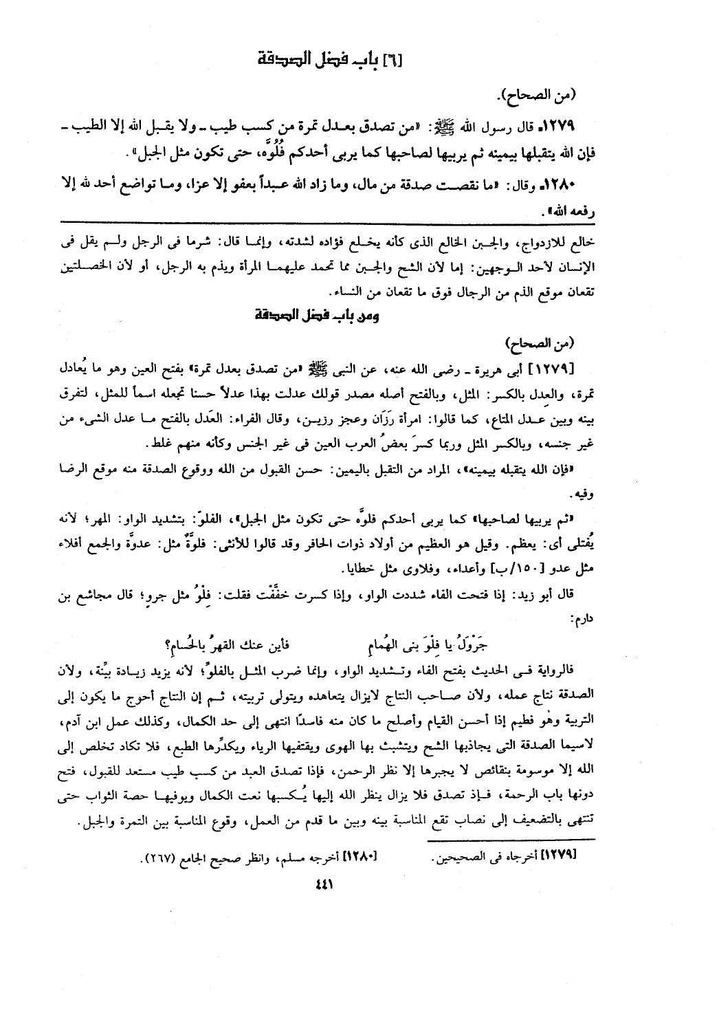 [1279] أبي هريرة- رضي الله عنه، عن النبي - صلى الله عليه وسلم - (من تصدق بعدل تمرة) بفتح العين وهو ما يعادل تمرة، والعدل بالكسر: المثل، وبالفتح أصله مصدر قولك عدلت بهذا عدلا حسنا تجعله اسما للمثل، لتفرق بينه وبين عدل المتاع، كما قالوا: امرأة رزان وعجز رزين، وقال الفراء: العدل بالفتح ما عدل الشيء من غير جنسه، وبالكسر المثل وربما كسر بعض العرب في غير الجنس وكأنه منهم غلط.