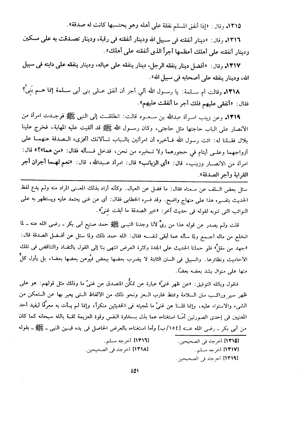 فنقول وبالله التوفيق: (عن ظهر غني) عبارة عن تمكن المتصدق عن غني ما وذلك مثل قولهم: هو على ظهر سير وراكب متن السلامة وممتط غارب العز ونحو ذلك من الألفاظ التي يعبر بها عن التمكن من الشيء والاستواء عليه، وإنما قلنا عن غني ما لمجيئه في الحديثين منكرا، وإنما لم يأت به معرفا ليفيد أحد المعنيين في إحدى الصورتين أما استغناءه عما بذل بسخاوة النفس وقوة العزيمة ثقة بالله سبحانه كما كان من أبي بكر- رضي الله عنه [154/ب] وأما استغناءه بالعرض الحاصل في يده فبين النبي - صلى الله عليه وسلم - بقوله