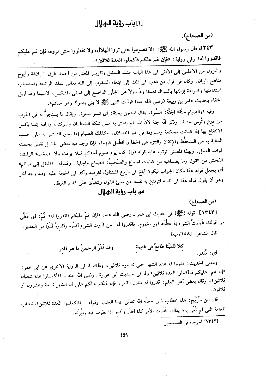 [1343] قوله (- صلى الله عليه وسلم -) في حديث ابن عمر- رضي الله عنه: (فإن غم عليكم فاقدروا له) غم: أي غطى من قولك غممت الشيء إذ غطيته فهو مغموم. فاقدروا له: من قدرت الشيء أقدره وأقدره قدرا من التقدير.
