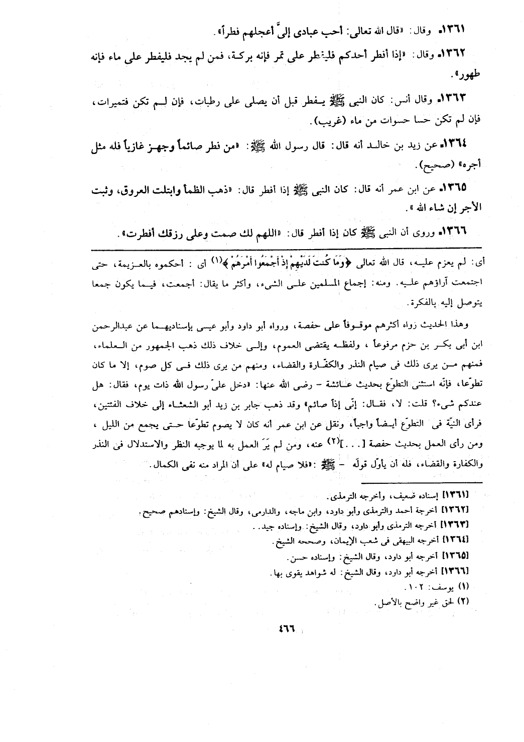 وهذا الحديث رواه أكثرهم موقوفًا على حفصة، ورواه أبو داود وأبو عيسى بإسناديهما عن عبد الرحمن ابن أبي بكر بن حزم مرفوعًا، ولفظه يقتضي العموم، وإلى خلاف ذلك ذهب الجمهور من العلماء، فمنهم من يرى ذلك فى صيام النذر والكفارة والقضاء، ومنهم من يرى ذلك في كل صوم، إلا ما كان تطوعًا، فإنه استثنى التطوع بحديث عائشة -رضى الله عنها: (دخل على رسول الله - صلى الله عليه وسلم - ذات يوم، فقال: هل عندك شيء؟ قلت: لا، فقال: إنى إذًا صائم) وقد ذهب جابر بن زيد أبو الشعشاء إلى خلاف الفئتين، فرأى النية فى التطوع أيضًا واجبًا، وتقل عن ابن عمر أنه كان لا يصوم تطوعًا حتى يجمع من الليل، ومن رأى العمل بحديث حفصة [...] عنه، ومن لم ير العمل به لما يوجبه النظر والاستدلال في النذر والكفارة والقضاء، فله أن يأول قوله (فلا صيام له) على ان المراد منه نفي الكمال.
