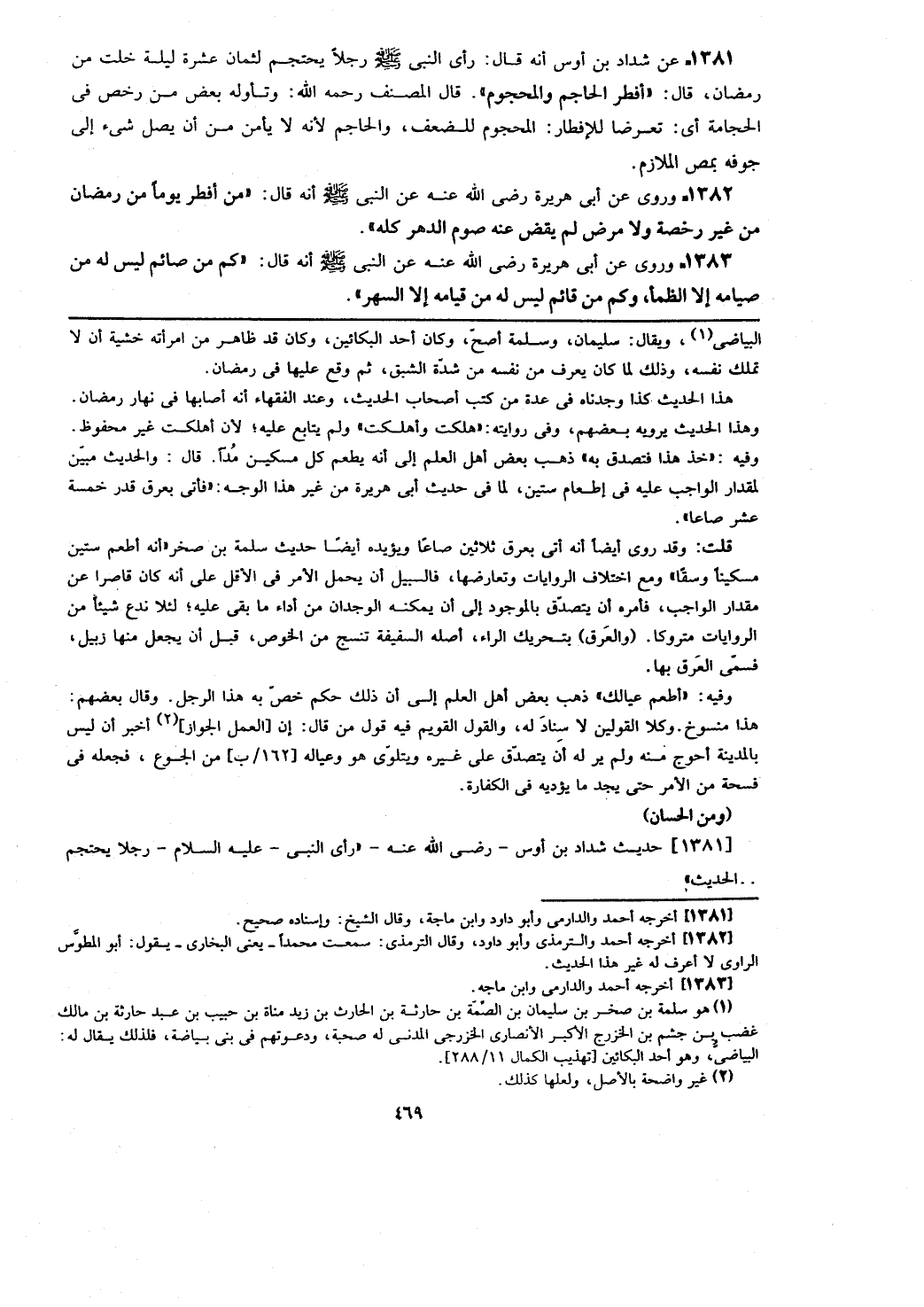 (ومن الحسان) [1381] حديث شداد بن أوس -رضى الله عنه- (رأى النبى - عليه السلام- رجلا يحتجم .. الحديث)