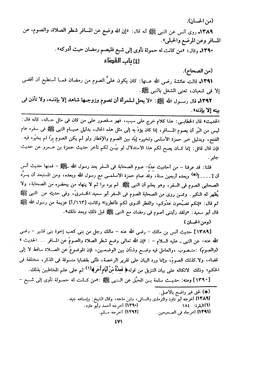 (ومن الحسان) [1389] حديث أنس بن مالك -رضى الله عنه- مالك رجل من بني كعب إخوة بني قشير- رضي الله عنه- عن النبي - عليه السلام-: (إن الله تعالى وضع شطر الصلاة والصوم عن المسافر ... الحديث) (والصوم): منصوب، والعامل فيه وضع شتان بين الوضعين، فإن الموضوع عن الصلاة ساقط لا إلى قضاء، ولا كذلك الصوم، وإنما ورد البيان على تقرير الرخصة، فأتى بقضايا منسوقة في الذكر، مختلفة في الحكم؛ وذلك لاتكاله على بيان التنزيل من قوله {فعدة من ايام أخر} ثم على علم المخاطبين بذلك.