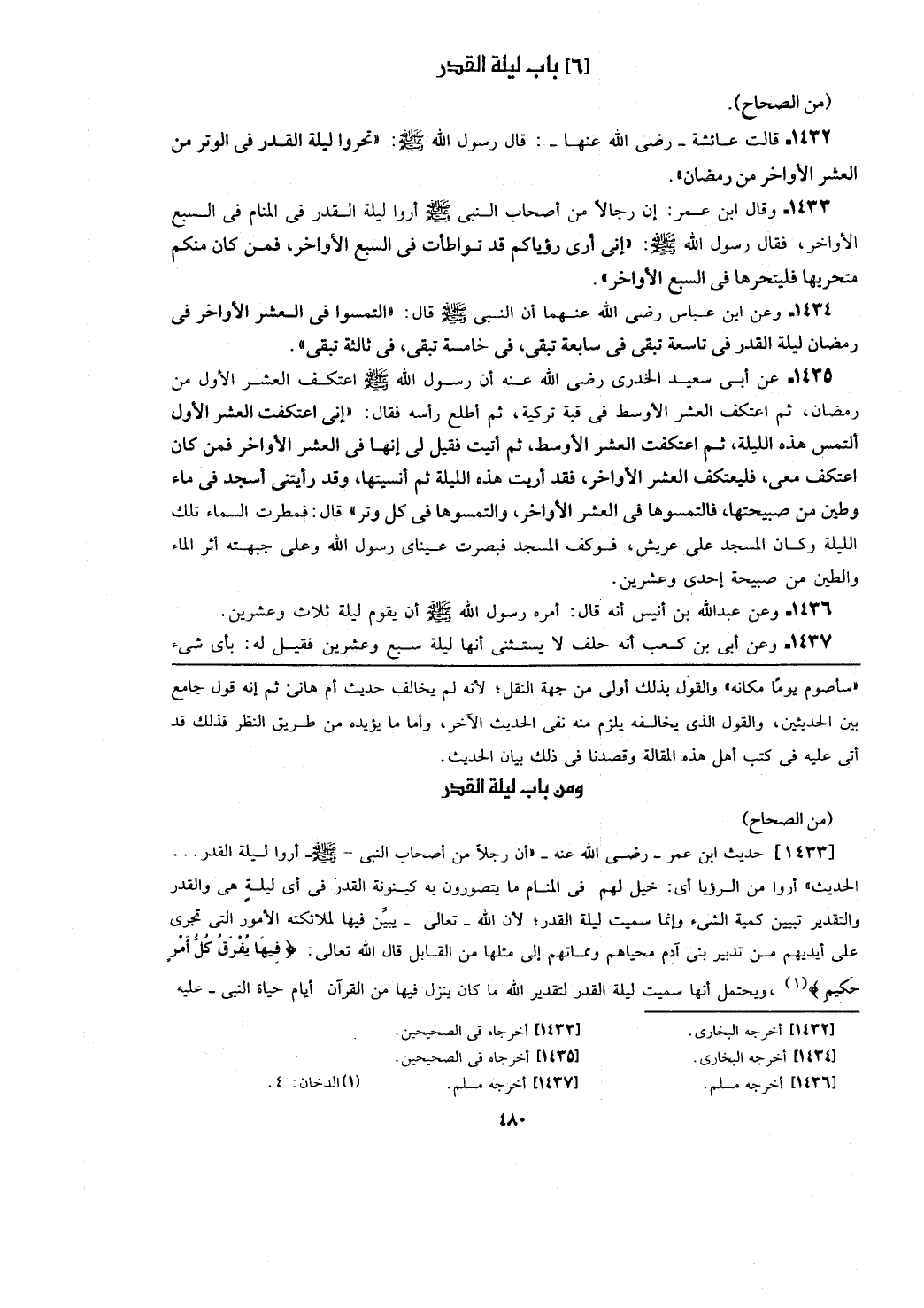 (من الصحاح) [1433] حديث ابن عمر - رضى الله عنه- (أن رجلًا من اصحاب النبي - صلى الله عليه وسلم - أروا ليلة القدر ... أروا من الرؤيا أى: قيل لهم في المنام ما يتصورون به كينونة القدر فى اى ليلة هى والقدر والتقدير تبيين كمية الشيء وإنما سميت ليلة القدر؛ لأن الله - تعالى- يبين فيها لملائكته الأمور التى تجرى على أيديهم من تدبير بنى آدم محياهم ومماتهم إلى مثلها من القابل قال الله تعالى: {فيها يفرق كل امر حكيم}، ويحتمل أنها سميت ليلة القدر تقدير الله ما كان ينزل فيها من القرآن أيام حياة النبي - عليه