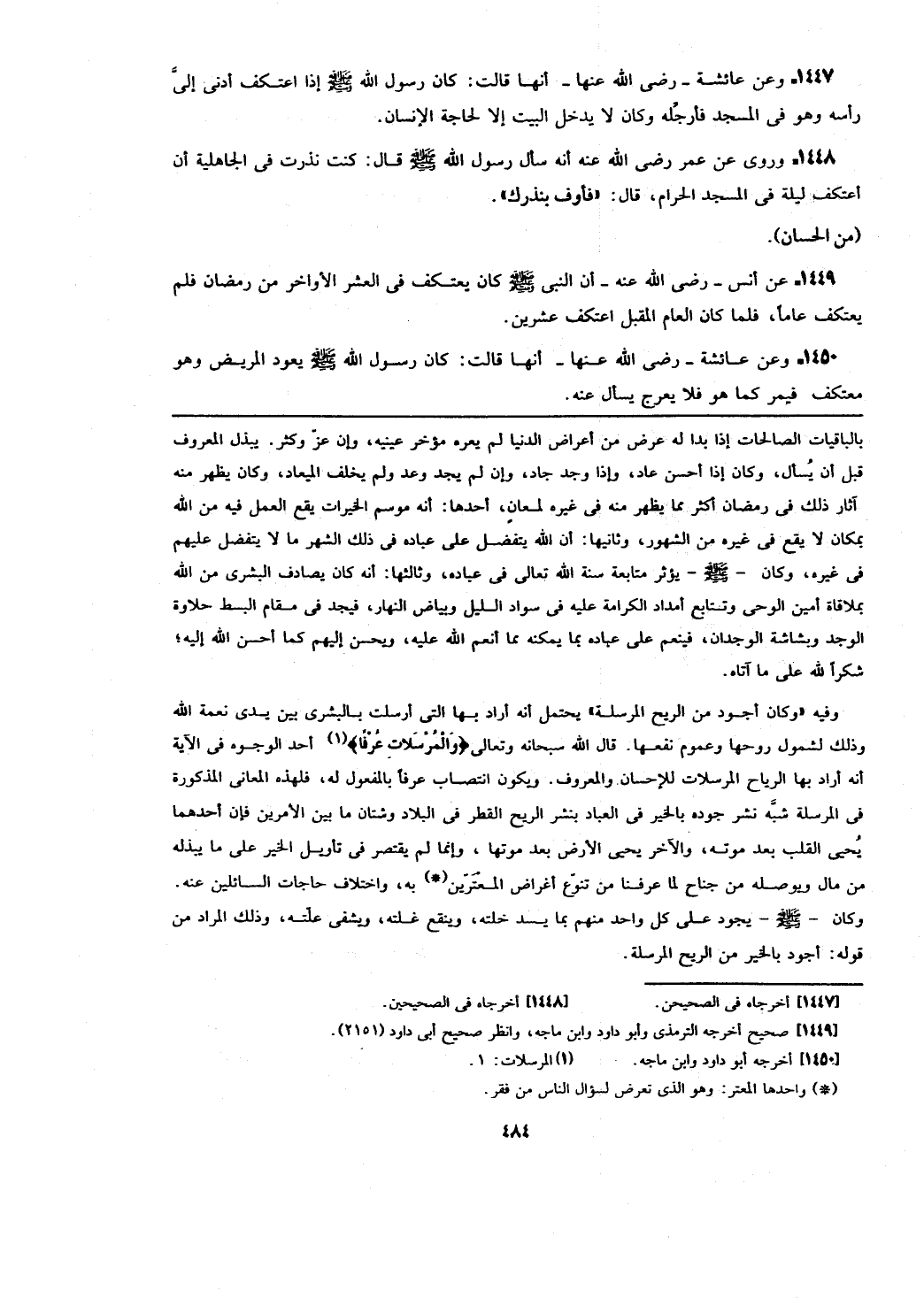 بالباقيات الصالحات إذا بدا له عرض من أعراض الدنيا لم يعره مؤخر عينيه، وإن عزّ وكثر. يبذل المعروف قبل أن يُسأل، وكان إذا أحسن عاد، وإذا وجد جاد\ن وإن لم يجد وعد ولم يخلف الميعاد، وكان يظهر منه آثار ذلك في رمضان أكثر مما يظهر منه في غيره لمعان، أحدها: أنه موسم الخيرات يقع العمل فيه من الله بمكان لا يقع في غيره من الشهور، وثانيها: أن الله يتفضّل على عباده في ذلك الشهر ما لا يتفضل عليهم في غيره، وكان - صلى الله عليه وسلم - يؤثر متابعة سنة الله تعالى في عباده، وثالثها: أنه كان يصادف البشرى من الله بملاقاة أمين الوحي وتتابع أمداد الكرامة عليه في سواد الليل وبياض النهار، فيجد في مقام البسط حلاوة الوجد وبشاشة الوجدان، فينعم على عباده بما يمكنه مما أنعم الله عليه، ويحسن إليهم كان أحسن الله إليه؛ شكرًا لله على ما آتاه.
