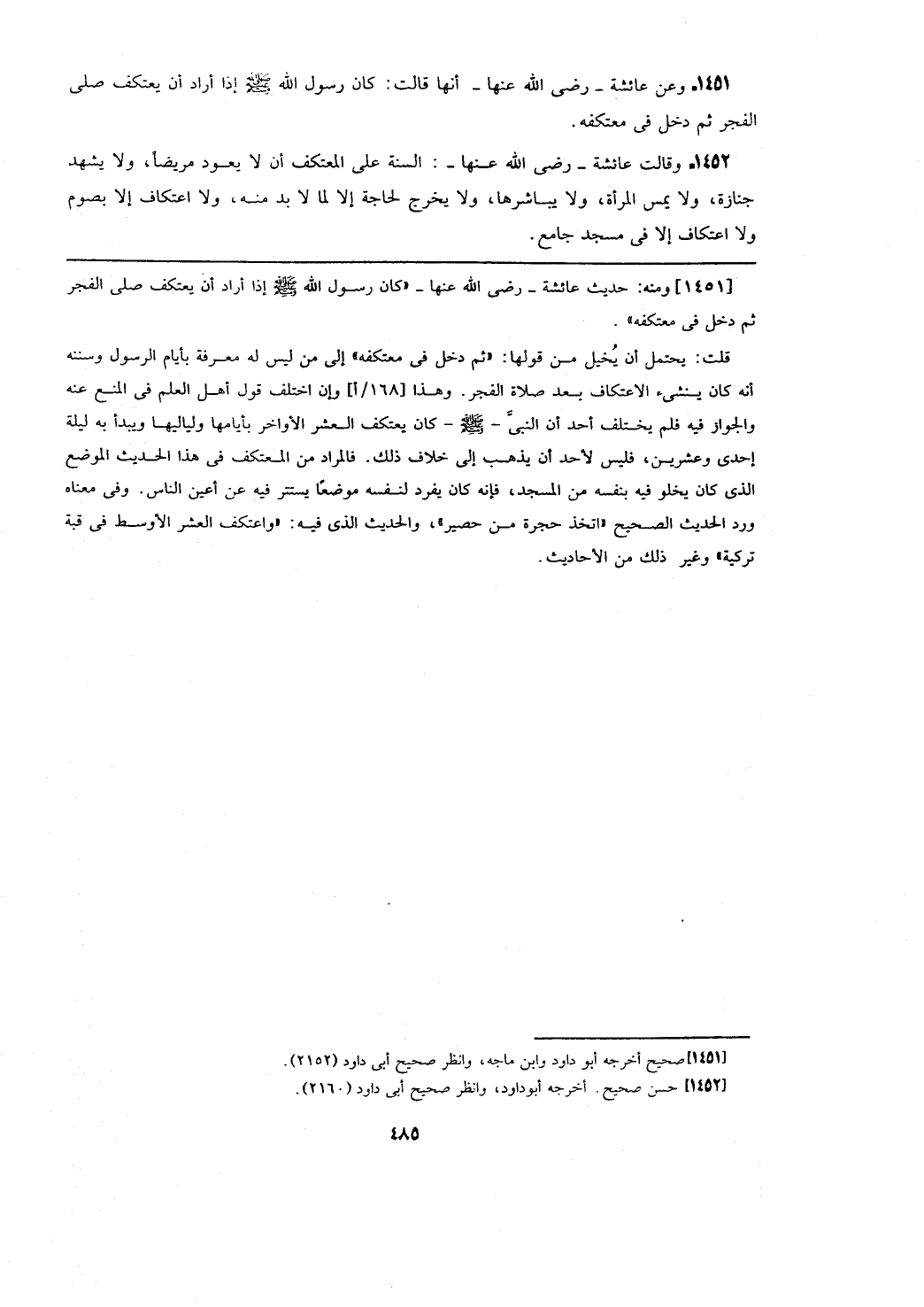 [1451] ومنه: حديث عائشة - رضي الله عنها - (كان رسول الله - صلى الله عليه وسلم - إذا أراد أن يعتكف صلى الفجر ثم دخل في معتكفه).