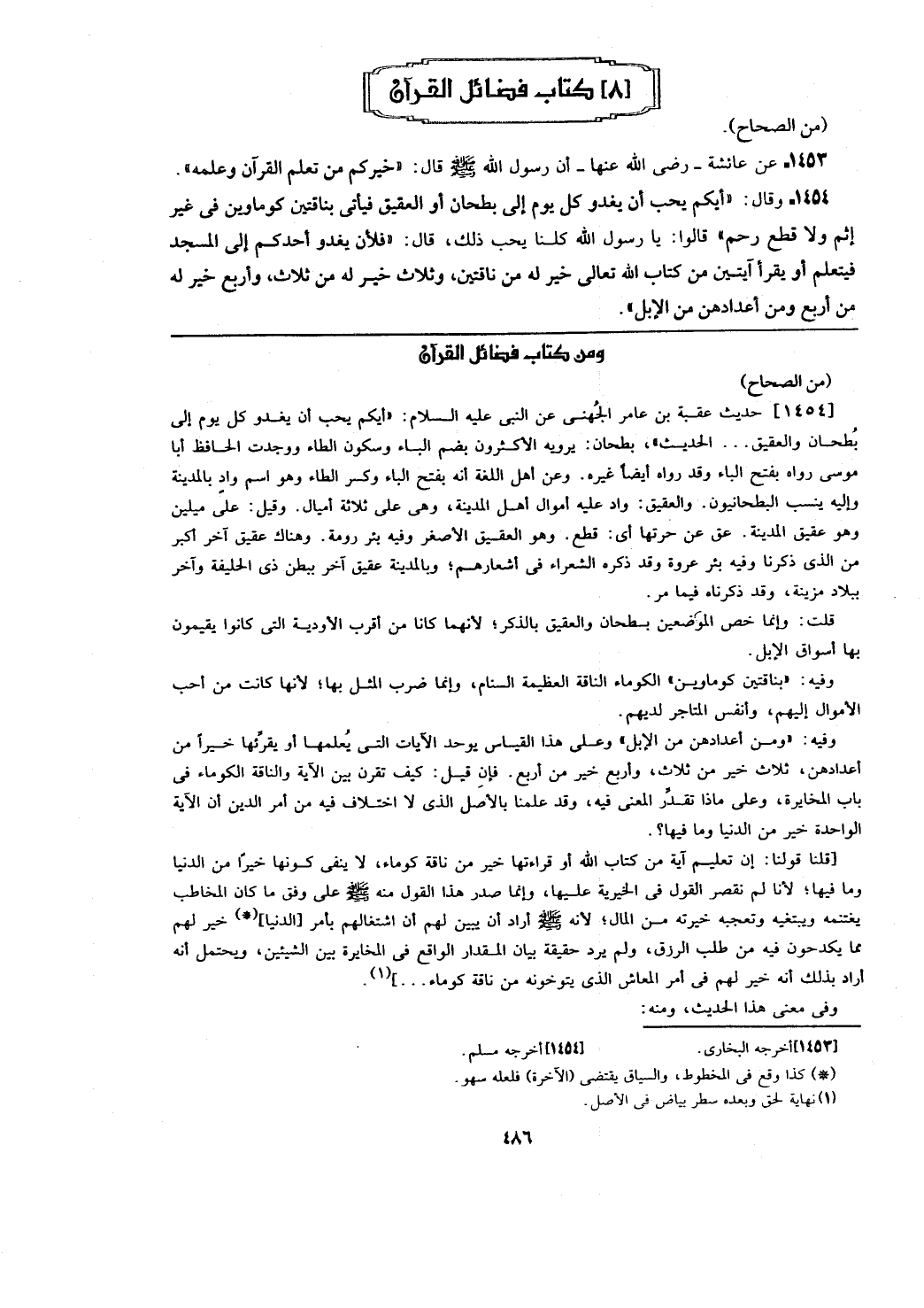 [1454] حديث عقبة بن عامر الجُهني عن النبي عليه السلام: (أيكم يحب أن يغدو كل يوم إلى بُطحان والعقيق ... الحديث)، بطحان يرويه الأكثرون بضم الباء وسكون الطاء ووجدت الحافظ أبا موسى رواه بفتح الباء وقد رواه أيضًا غيره. وعن أهل اللغة أنه بفتح الباء وكسر الطاء وهو اسم وادٍ بالمدينة وإليه ينسب البطحانيون. والعقيق: واد عليه أموال أهل المدينة، وهي على ثلاثة أميال. وقيل: على ميلين وهو عقيق المدينة. عق عن حرتها أي: قطع. وهو العقيق الأصغر وفيه بئر رومة. وهناك عقيق آخر أكبر من الذي ذكرنا وفيه بئر عروة وقد ذكره الشعراء في أشعارهم؛ وبالمدينة عقيق آخر ببطن ذي الحليفة وآخر ببلاد مزينة، وقد ذكرناه فيما مر.