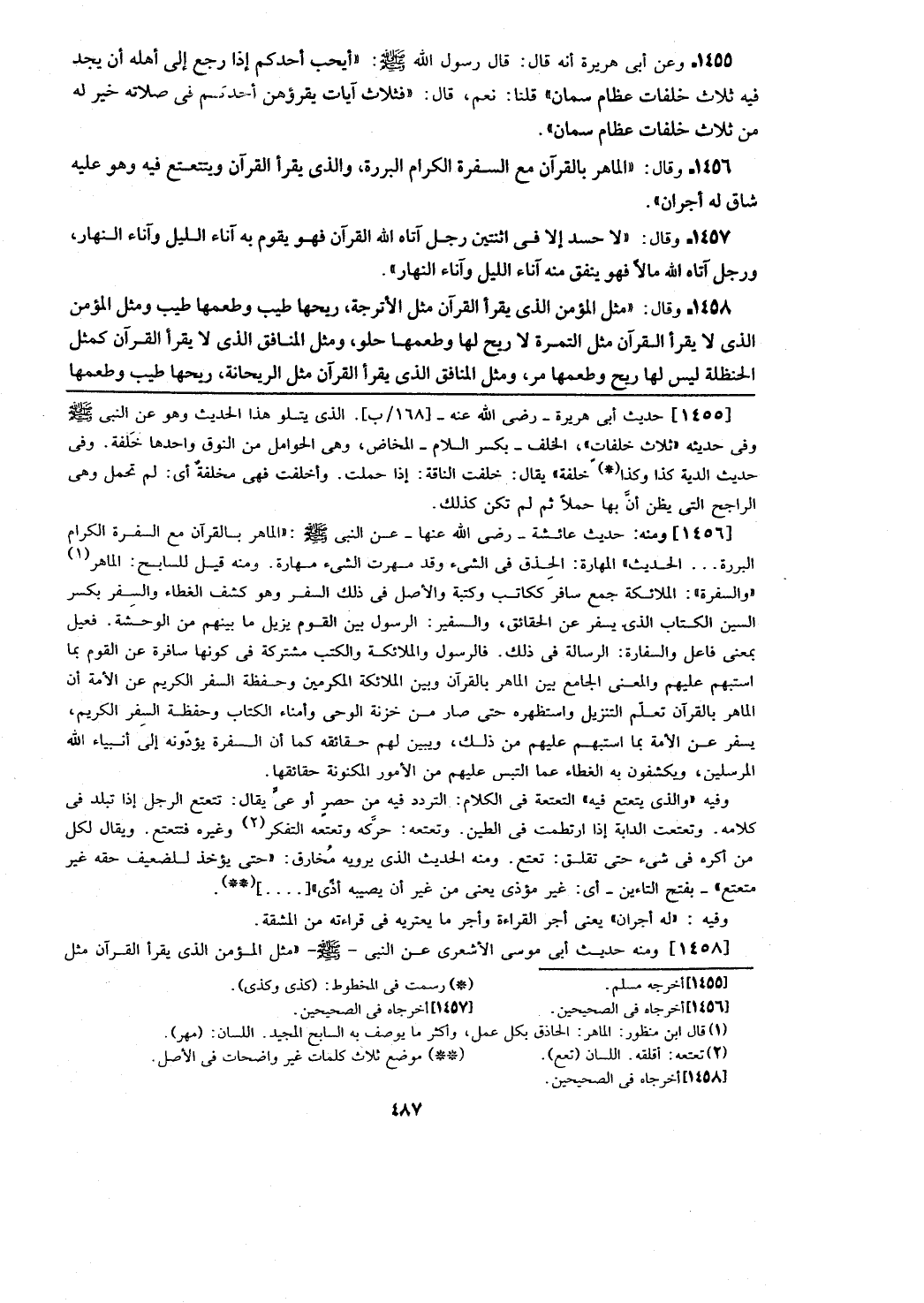 [1458] ومنه حديث أبي موسى الأشعري عن النبي - صلى الله عليه وسلم - (مثل المؤمن الذي يقرأ القرآن مثل