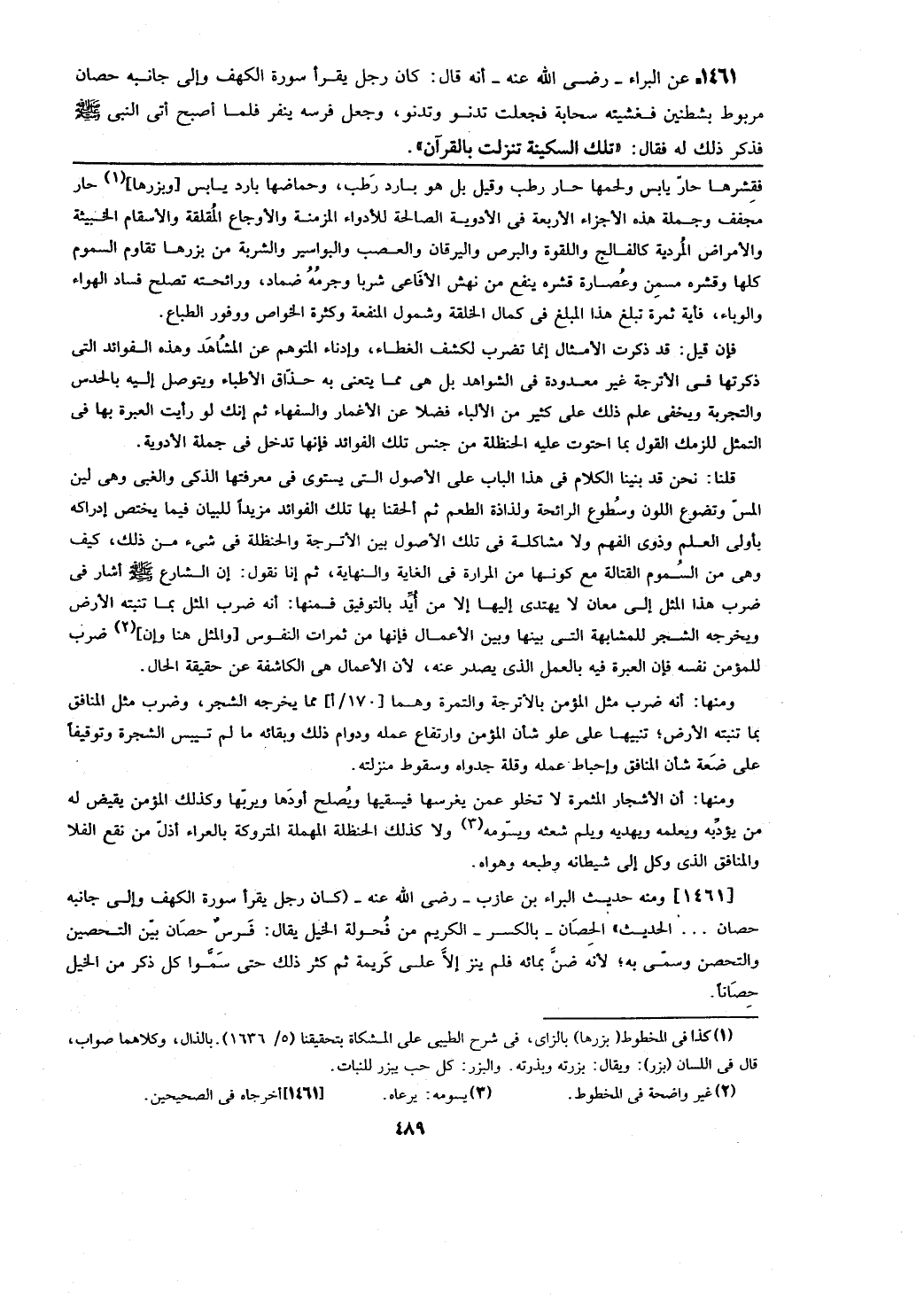 [1461] ومنه حديث البراء بن عازب - رضي الله عنه - (كان رجل يقرأ سورة الكهف وإلى جانبه حصان ... الحديث (الحِصَان - بالكسر - الكريم من فُحولة الخيل يقال: فَرسٌ حصَان بين التحصين والتحصين وسمّى به، لأنه ضنَّ بمائه فلم ينز إلاَّ على كَريمة ثم كثر ذلك حتى سّمَّوا كل ذكر من الخيل حِصَانًا.