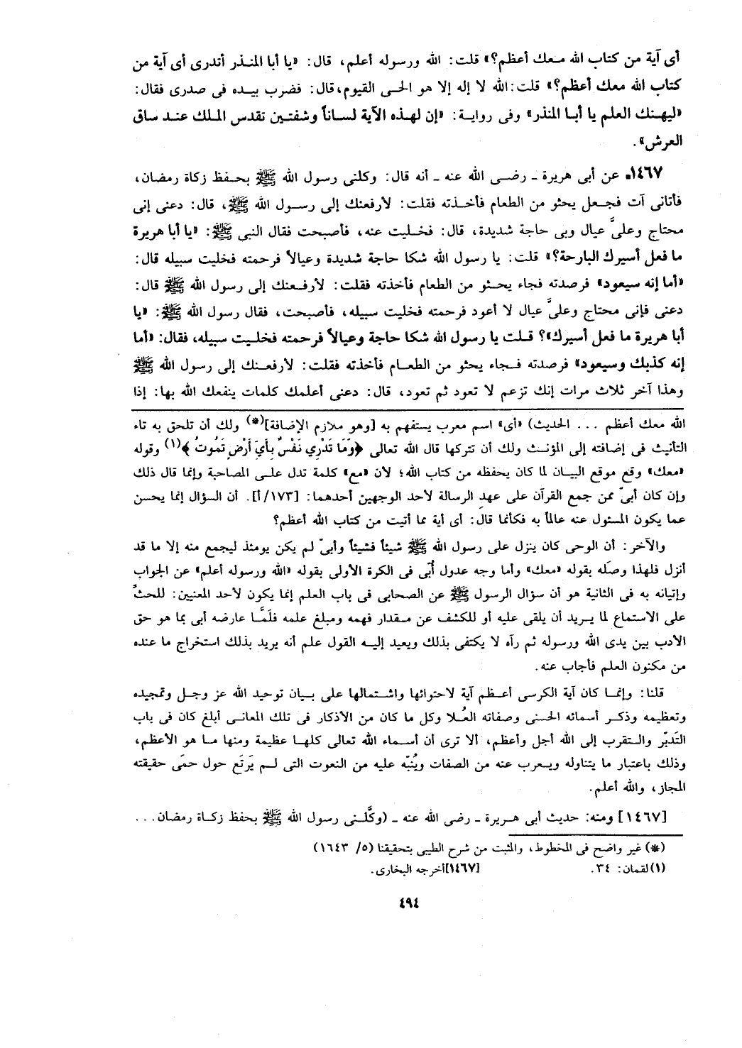 [1467] ومنه: حديث أبي هريرة - رضي الله عنه - (وكَّلني رسول الله - صلى الله عليه وسلم - بحفظ زكاة رمضان ...
