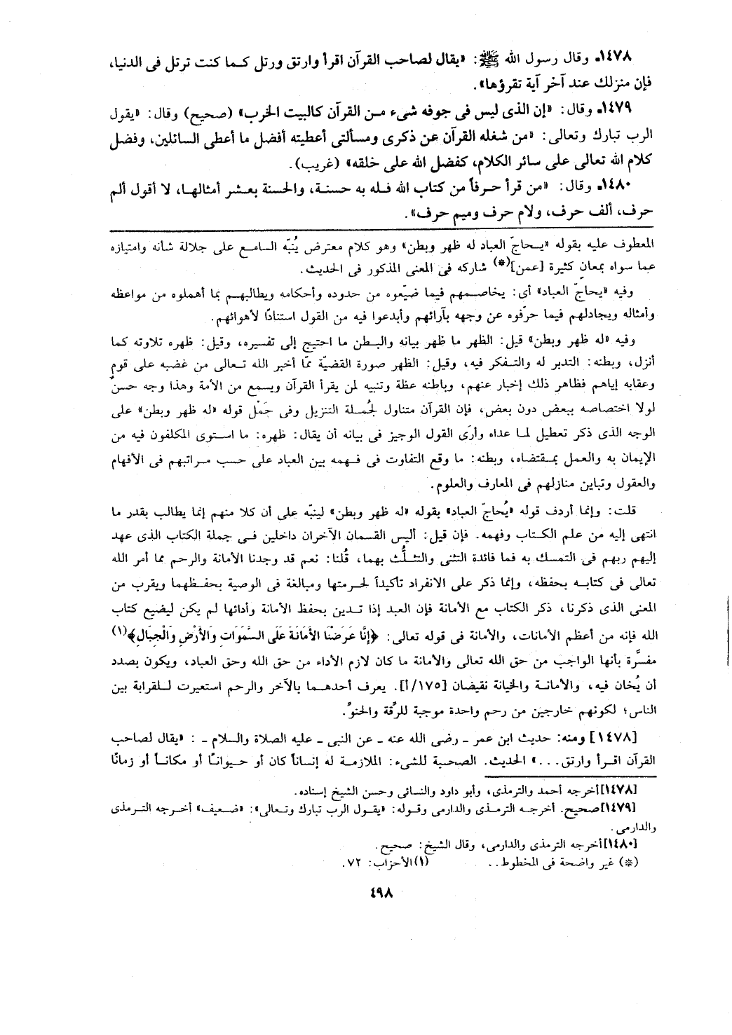 قلت: وإنما أردف قوله (يُحاج العباد) بقوله (له ظهر وبطن) لينبّه على أن كلا منهم إنما يطالب بقدر ما انتهى إليه من علم الكتاب وفهمه. فإن قيل: أليس القسمان الآخران داخلين في جملة الكتاب الذي عهد إليهم ربهم في التمسك به فما فائدة التثني والتثلُّث بهما، قُلنا: نعم قد وجدنا الأمانة والرحم مما أمر الله تعالى في كتابه بحفظه، وإنما ذكر على الانفراد تأكيدًا لحرمتها ومبالغة في الوصية بحفظهما ويقرب من المعنى الذي ذكرنا، ذكر الكتاب مع الأمانة فإن العبد إذا تدين بحفظ الأمانة وأدائها لم يكن ليضيع كتاب الله فإنه من أعظم الأمانات، والأمانة في قوله تعالى: {إنا عرضنا الأمانة على السموات والأرض والجبال} مفسَّرة بأنها الواجب من حق الله تعالى والأمانة ما كان لازم الأداء من حق الله وحق العباد، ويكون بصدد أن يُخان فيه، والأمانة والخيانة نقيضان [175/أ]. يعرف أحدهما بالآخر والرحم استعيرت للقرابة بين الناس؛ لكونهم خارجين من رحم واحدة موجبة للرَّقة والحنوَّ.