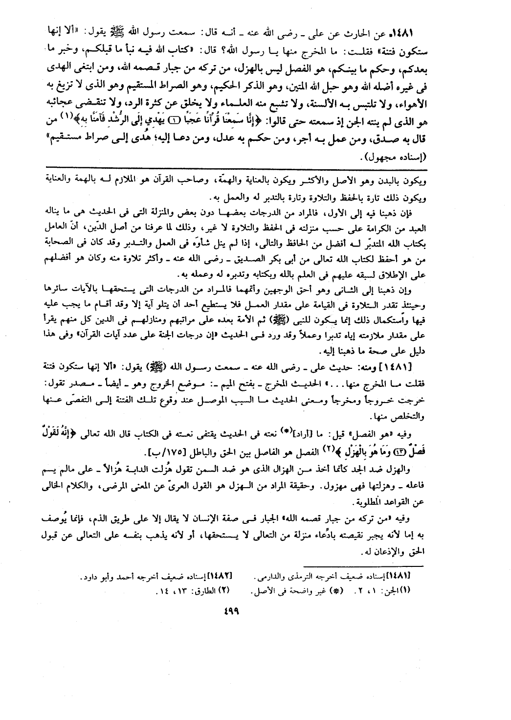 فإن ذهبنا فيه إلى الأول، فالمراد من الدرجات بعضها دون بعض والمنزلة التي في الحديث هي ما يناله العبد من الكرامة على حسب منزلته في الحفظ والتلاوة لا غير، وذلك لما عرفنا من أصل الدّين، أنّ العامل بكتاب الله المتدّبر له أفضل من الحافظ والتالي، إذا لم ينل شأوَه في العمل والتدبر وقد كان في الصحابة من هو أحفظ لكتاب الله تعالى من أبي بكر الصديق - رضي الله عنه - وأكثر تلاوة منه وكان هو أفضلهم على الإطلاق لبقه عليهم في العلم بالله وبكتابه وتدبره له وعمله به.