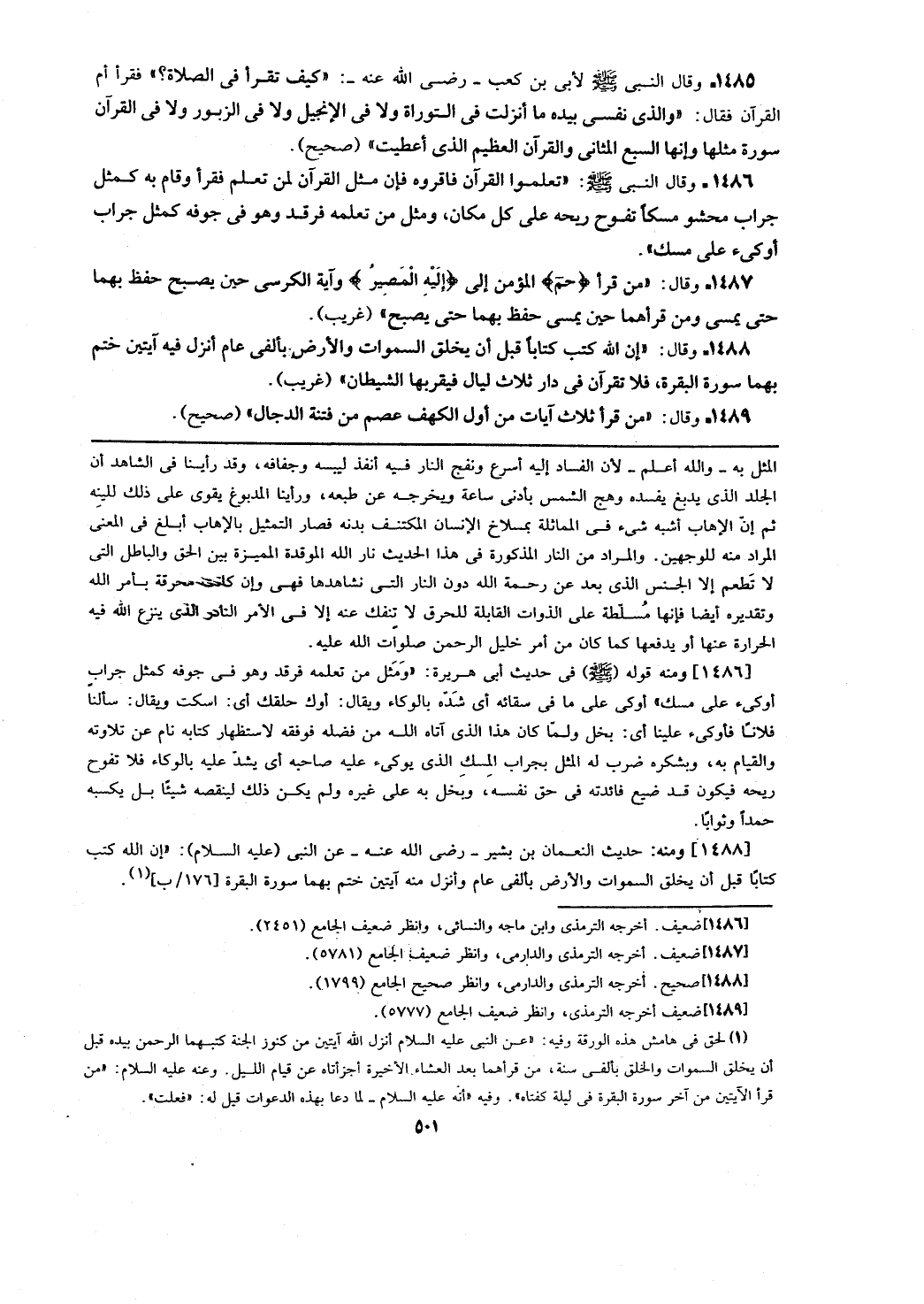 [1486] ومنه قوله - صلى الله عليه وسلم - في حديث أبي هريرة: (ومثل من تعلمه فرقد وهو في جوفه كمثل جراب أوكئ فأوكئ علينا أي: بخل ولما كان هذا الذي آتاه الله من فضله فوفقه لاستظهار كتابه نام عن تلاوته والقيام به، وبشكره ضرب له المثل بجراب المسك الذي يؤكئ عليه صاحبه أي يشد عليه بالوكاء فلا تفوح ريحه فيكون قد ضيع فائدته في حق نفسه، وبخل به على غيره ولم يكن ذلك لينقصه شيئا بل يكسبه حمدا وثوابا.