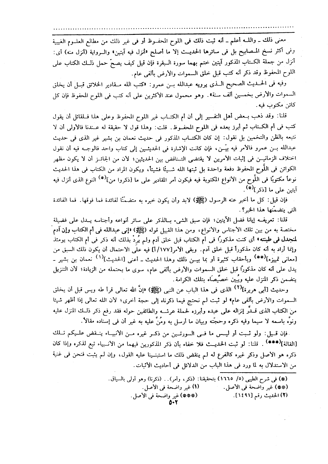 قلنا: وقد ذهب بعض أهل التفسير إلى أن أم الكتاب غير اللوح المحفوظ وعلى هذا فلقائل أن يقول كتب في أم الكتاب ثم أبرز بعده في اللوح المحفوظ. قلت: وهذا قول لا حقيقة له عندنا فالأولى أن لا نتبعه بالظن والتخمين بل نقول: إن كان الكتاب المذكور في حديث نعمان بن بشير غير الذي في حديث عبد الله بن عمرو فالأمر فيه بين، فإن كانت الإشارة في الحديثين إلى كتاب واحد فالوجه فيه أن نقول اختلاف الزمانين في إثبات الأمرين لا يقتضي التناقض بين الحديثين؛ لأن من الجائز أن لا يكون مظهر الكوائن في اللوح المحفوظ دفعة واحدة بل ثبتها الله شيئا فشيئا، ويكون المراد في هذا الحديث نوعا مكتوبا في اللوح من الأنواع المكتوبة فيه فيكون أمر المقادير على ما [ذكروا من] النوع الذي أنزل فيه آيتين على ما [ذكر].