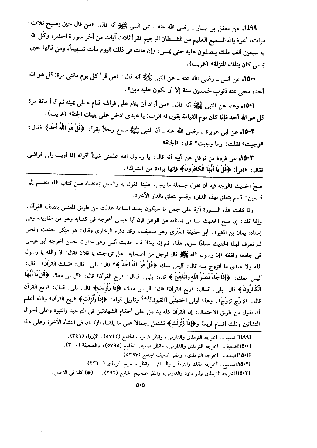 ولما كانت هذه السورة آتية على جمل ما سيكون بعد الساعة عدلت من طريق المعنى بنصف القرآن. وإنما قلنا: إن صح الحديث لما في إسناده من الوهن فإن أبا عيسى أخرجه في كتابه وهو من مفاريده وفي إسناده يمان بن المغيرة. أبو حذيفة العنزي وهو ضعيف، وقد ذكره البخاري وقال: هو منكر الحديث ونحن لم نعرف لهذا الحديث سنادا سوا هذا، ثم إنه يخالف حديث أنس وهو حديث حسن أخرجه أبو عيسى في جامعه ولفظه (إن رسول الله - صلى الله عليه وسلم - قال لرجل من أصحابه: هل تزوجت يا فلان فقال: لا والله يا رسول الله ولا عندي ما أتزوج به قال: أليس معك {قل هو الله أحد}؟ قال: بلى. قال: (ثلث القرآن). قال: أليس معك: {إذا جاء نصر الله والفتح} قال: بلى. قال: (ربع القرآن) قال: أليس معك {قل يا أيها الكافرون} قال: بلى. قال: (ربع القرآن) قال: أليس معك {إذا زلزت} قال: بلى. قال: (ربع القرآن) قال: (تزوج تزوج).) وهذا أولى الحديثين [القبول] وتأويل قوله: {إذا زلزلت} (ربع القرآن) والله أعلم أن نقول من طريق الاحتمال: إن القرآن كله يشتمل على أحكام الشهادتين في التوحيد والنبوة وعلى أحوال النشأتين وذلك أقسام أربعة و {إذا زلزلت} تشمل إجمالا على ما يلقاه الإنسان في النشأة الآخرة وعلى هذا