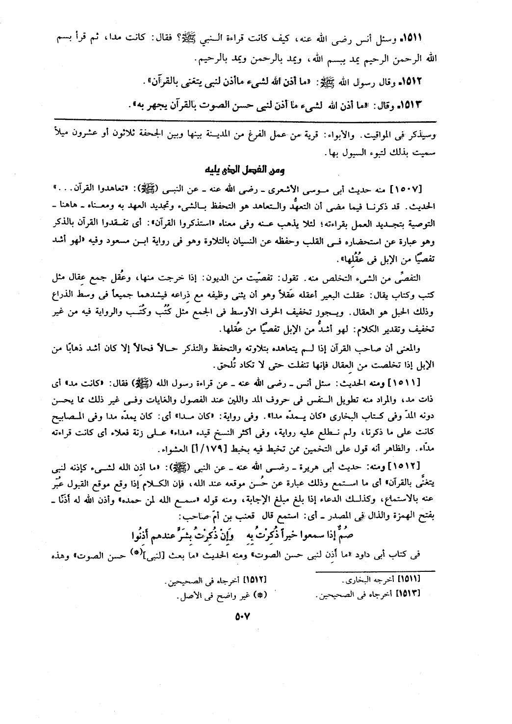[1507] منه حديث أبي موسى الأشعري - رضي الله عنه - عن النبي (- صلى الله عليه وسلم -): (تعاهدوا القرآن ...) الحديث. قد ذكرنا فيما مضى أن التعهد والتعاهد هو التحفظ بالشيء وتجديد العهد به ومعناه - هاهنا - التوصية بتجديد العمل بقراءته؛ لئلا يذهب عنه وفي معناه (استذكروا القرآن): أي تفقدوا القرآن بالذكر وهو عبارة عن استحضاره في القلب وحفظه عن النسيان بالتلاوة وهو في رواية ابن مسعود وفيه (لهو أشد تفصيا من الإبل في عقلها).