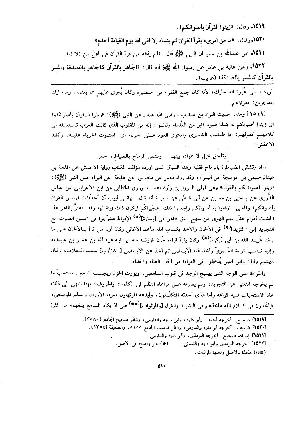 أراد وتشقى الضياطرة بالرماح فقلبه وهذا السياق الذي أورده مؤلف الكتاب رواية الأعمش عن طلحة بن عبد الرحمن بن عوسجة عن البراء، وقد رواه معمر عن منصور عن طلحة عن البراء عن النبي (- صلى الله عليه وسلم -): (زينوا أصواتكم بالقرآن) وهي أولى الروايتين وأرضاهما، وروى الخطابي عن ابن الأعرابي عن عباس الدوري عن يحيى بن معين عن أبي قطن عن شعبة أنه قال: نهاني أيوب أن أحدث: (زينوا القرآن بأصواتكم) والمعنى: ارفعوا به أصواتكم واجعلوا ذلك هجيراكم ليكون ذلك زينة لها وقد اغتر بظاهر هذا الحديث أقوام عدل بهم الهوى عن منهج الحق فتاهوا في [بحارة] الإفراط فتدرجوا في تحسين الصوت مع التجويد إلى [التزيد] في الألحان والأخذ بكتاب الله مأخذ الأغاني وكان أول من قرأ بالألحان على ما بلغنا عبيد الله بن أبي [بكرة] وكان يقرأ قراءة حزن فورثه منه ابن ابنه عبيد الله بن عمر بن عبيد الله وإليه تنسب قراءة العمري وأخذ عنه الأباضي ثم أخذ عن الأباضي [180/ب] سعيد العلاف، وكان الهشيم وأبان وابن أعين يدخلون في القراءة من ألحان الغناء والحداء.