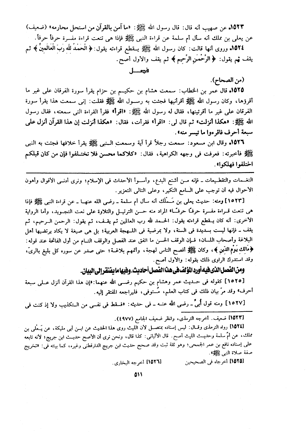 [1523] ومنه: حديث يعلى بن مملك أنه سأل أم سلمة - رضي الله عنها - عن قراءة النبي ? فإذا هي تنعت قراءة مفسرة حرفا حرفا) المراد منه حسن الترتيل والتلاوة على نعت التجويد، وأما الرواية الأخرى: أنه كان يقطع قراءته يقول: الحمد لله رب العالمين ثم يقف، ثم يقول: الرحمن الرحيم، ثم يقف - فإنها ليست بسديدة في السنة، ولا بمرضية في اللهجة العربية؛ بل هي صيغة لا يكاد يرتضيها أهل البلاغة وأصحاب اللسان؛ فإن الوقف الحسن ما اتفق عند الفصل والوقف التام من أول الفاتحة عند قوله: {مالك يوم الدين}، وكان ? أفصح الناس لهجة، وأتمهم بلاغة؛ حتى صدر عن سوره كل بليغ بالرى، وقد استدرك الرواي ذلك بقوله: والأول أصح.