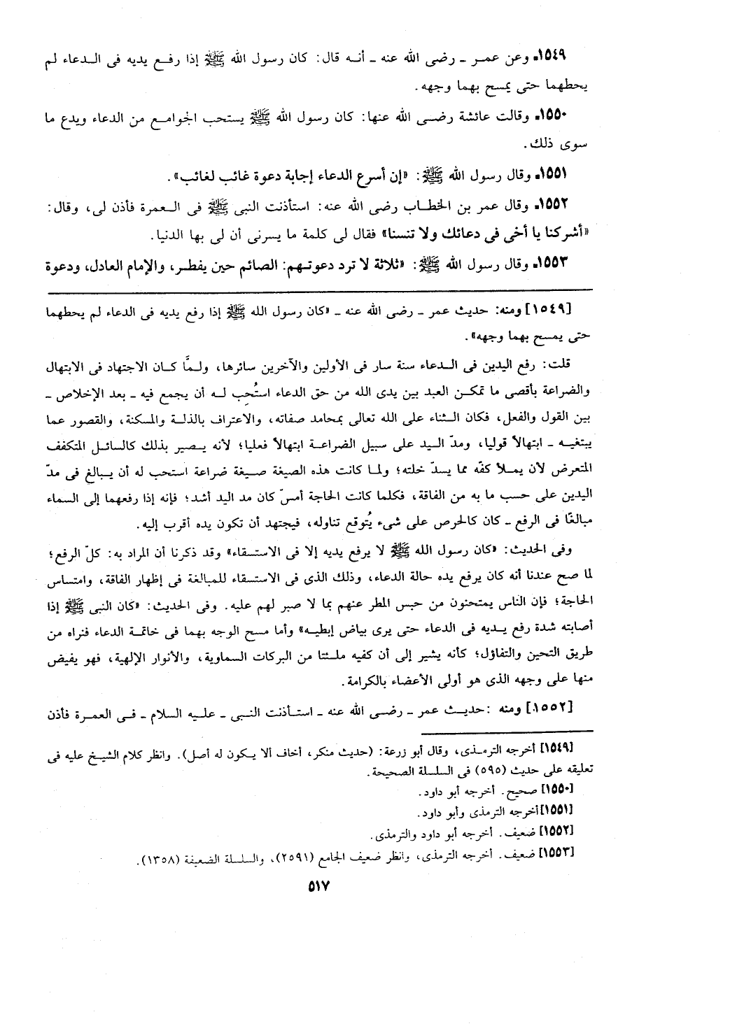 [1549] ومنه حديث عمر - رضي الله عنه - (كان رسول الله - صلى الله عليه وسلم - إذا رفع يديه في الدعاء لم يحطهما حتى يمسح بهما وجهه).