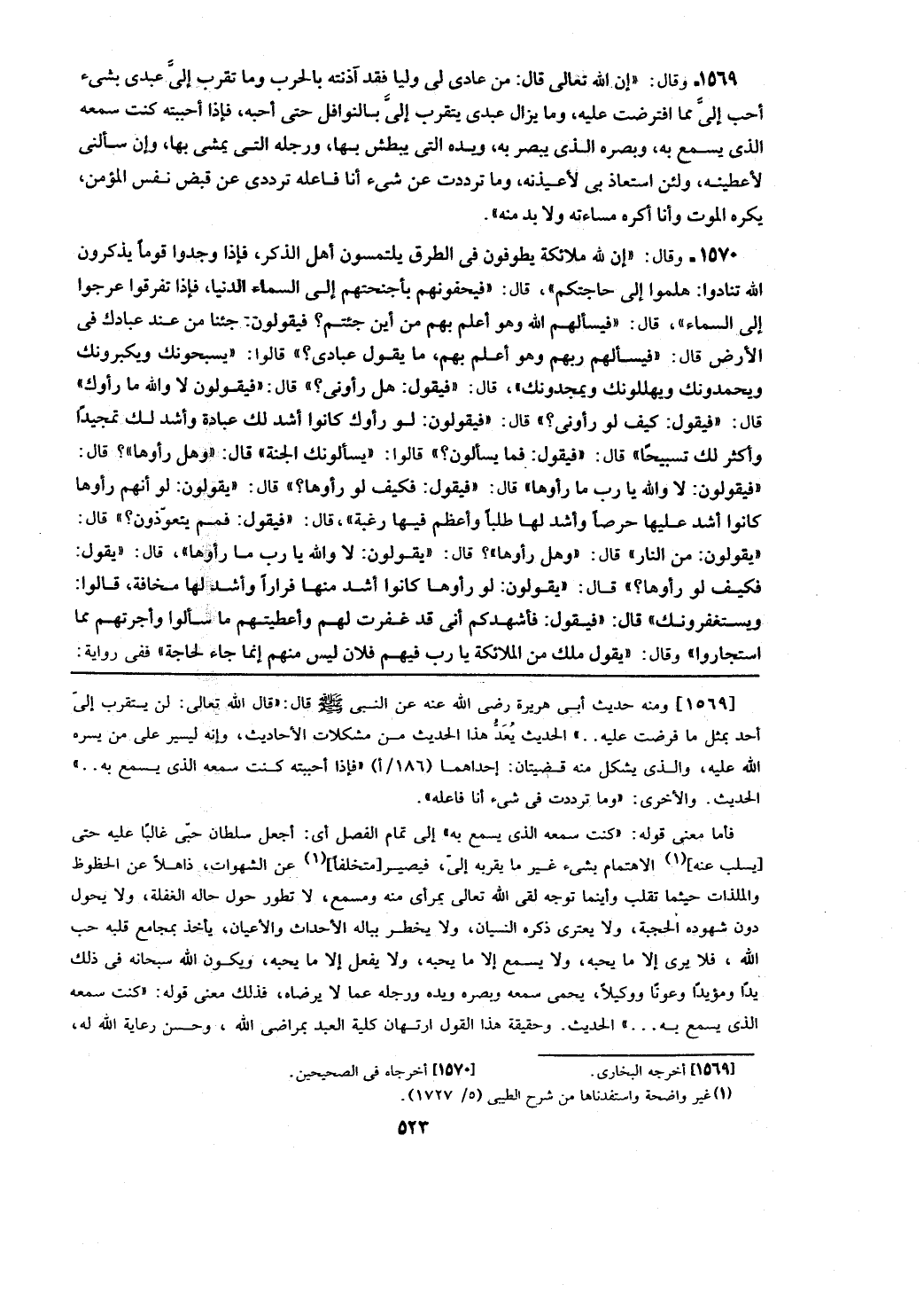 [1569] ومنه حديث أبي هريرة رضي الله عنه عن النبي - صلى الله عليه وسلم - قال: (قال الله تعالى: لن يتقرب إلي أحد بمثل ما فرضت عليه ..) الحديث يعد هذا الحديث من مشكلات الأحاديث، وإنه ليسير على من يسره الله عليه، والذي يشكل منه قضيتان: إحداهما (186/أ) (فإذا أحببته كنت سمعه الذي يسمع به ..) الحديث. والأخرى: (وما ترددت في شيء أنا فاعله).