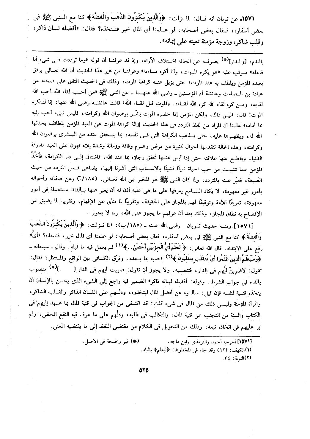 [1571] ومنه حديث ثوبان - رضي الله عنه - (185/ب): (لما نزلت: {والذين يكنزون الذهب والفضة} كنا مع النبي - صلى الله عليه وسلم - في بعض أسفاره، فقال بعض أصحابه: لو علمنا أي المال خير، فنتخذه؟ (أي) رفع على الابتداء. قال الله تعالى: {لنعلم أي الحزبين أحصى ..} لم يعمل فيه ما قبله. وقال - سبحانه - {وسيعلم الذين ظلموا أي منقلب ينقلبون} فنصبه بما بعده. وفرق الكسائي بين الواقع والمنتظر، فقال: تقول: لأضربن أيهم في الدار، فتنصبه. ولا يجوز أن تقول: ضربت أيهم في الدار [] منصوب بالفاء في جواب الشرط. وقوله أفضله لسانه ذاكر) الضمير فيه راجع إلى الشيء الذي يحسن بالإنسان أن يتخذه قنية لنفسه فإن قيل: سألوه عن أفضل المال ليتخذوه، ودلهم على اللسان الذاكر والقلب الشاكر، والمرأة المؤمنة وليس ذلك من المال في شيء قلت: قد اكتفى من الجواب في قنية المال بما عهد إليهم في الكتاب والسنة من التجنب عن قنية المال، والتكالب في طلبه، ودلهم على ما عرف فيه النفع المحض، ولم ير عليهم في اتخاذه تبعة، وذلك من التحويل في الكلام من مقتضى اللفظ إلى ما يقتضيه المعنى.