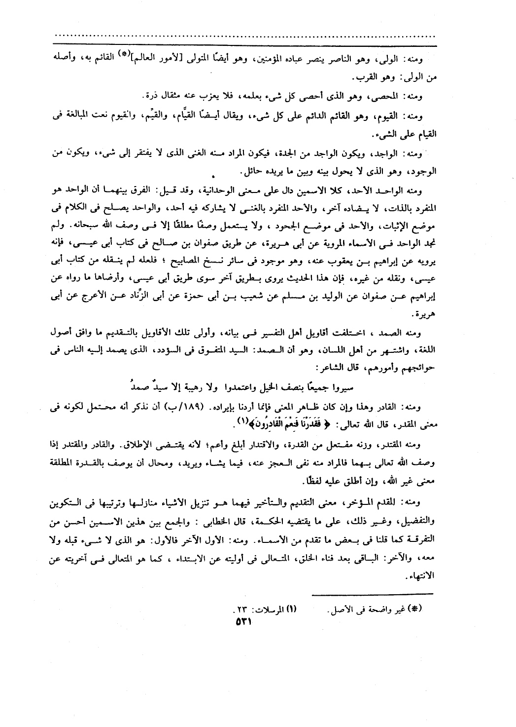 ومنه: الولي، وهو الناصر ينصر عباده المؤمنين، وهو أيضاً المتولي [لأمور العالم] القائم به، وأصله من الولي: وهو أقرب. ومنه: المحصي، وهو الذي أحصى كل شيء بعلمه، فلا يعزب عنه مثقال ذرة.