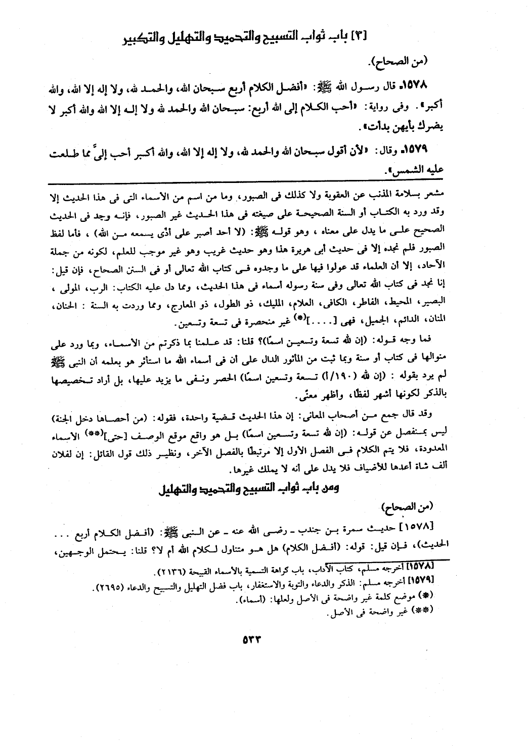 [1578] حديث سمرة بن جندب -رضي الله عنه- عن النبي - صلى الله عليه وسلم -: (أفضل الكلام أربع .... الحديث)، فإن قيل: قوله: (أفضل الكلام) هل هو متناول لكلام الله أم لا؟ قلنا: يحتمل الوجهين،