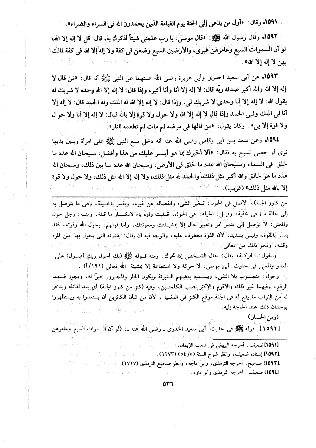 وحول: منصوب بلا النفي، ويسميه بعضهم التبرئة ويكون الجار والمجرور خبراً له، ويجوز فيها الرفع، وفيها غير ذلك والأقوم والأكثر نصب الكلمتين، وفيه (كنز من كنوز الجنة) أي يعد لقائله ويدخر له من الثواب ما يقع له في الجنة موقع الكنز في الدنيا، لأن من شأن الكانزين أن يستعدوا به ويستظهروا بوجدان ذلك عند الحاجة إليه.