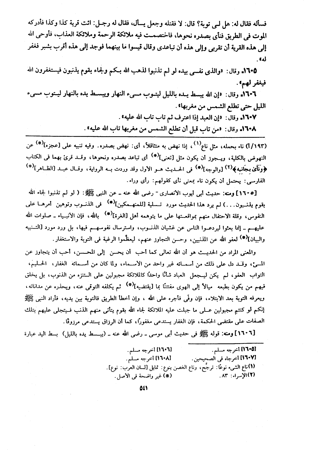 [1605] ومنه: حديث أبي أيوب الأنصاري -رضي الله عنه- عن النبي - صلى الله عليه وسلم -: (لو لم تذنبوا لجأ الله بقوم يذنبون ...) لم يرد هذا الحديث مورد تسلية [للمنهكين] في الذنوب وتوهين أمرها على النفوس، وقلة الاحتفال منهم بمواقعهتها على ما يتوهمه أهل [الغرة] بالله، فإن الأنبياء -صلوات الله عليهم- إنما بعثوا ليردعوا الناس عن غثيان الذنوب، واسترسال نفوسهم فيها، بل ورد مورد [التنبيه والبيان] لعفو الله عن المذنبين، وحسن التجاوز عنهم، ليعظموا الرغبة في التوبة والاستغفار.