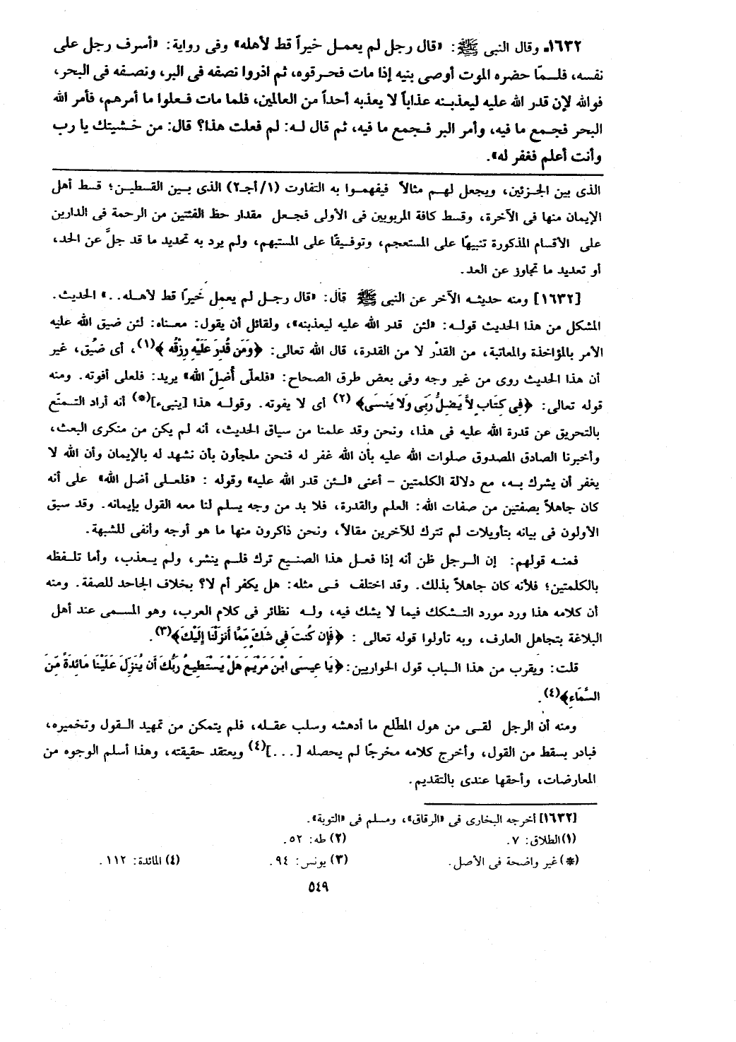 [1632] ومنه حديثه الآخر عن النبي - صلى الله عليه وسلم - قال: (قال رجل لم يعمل خيراً قط لأهله ...) الحديث. المشكل من هذا الحديث قوله: (لئن قدر الله عليه ليعذبنه)، ولقائل أن يقول: معناه: لئن ضيق الله عليه الأمر بالمؤاخذة والمعاتبة، من القدر لا من القدرة، قال الله تعالى: {ومن قُدِرَ عليه رزقه}، أي ضُيق، غير أن هذا الحديث روى من غير وجه وفي وجه وفي بعض طرق الصحاح: (فعلى أُضِلّ الله) يريد: فلعلي أفوته. ومنه قولة تعالى: {في كتاب لا يضل ربي ولا ينسى} أي لا يفوته. وقوله هذا [ينبئ] انه أراد التمنع بالتحريق عن قدرة الله عليه في هذا، ونحن وقد علمنا من سياق الحديث، أنه لم يكن من منكري البعث، وأخبرنا الصادق المصدوق صلوات الله عليه بأن الله غفر له فنحن ملجأون بأن نشهد له بالإيمان وأن الله لا يغفر لمن يشرك به، مع دلالة الكلمتين -أعني (لئن قدر الله عليه) وقوله: (فلعلي أضل الله) على أنه كان جاهلاً بصفتين من صفات الله: العلم والقدرة، فلابد من وجه يسلم لنا معه القول بإيمانه. وقد سبق الأولون في بيانه بتأويلات لم تترك للآخرين مقالاً، ونحن ذاكرون منها ما هو أوجه وأنفى للشبهة.